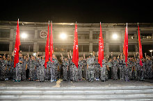 晚八点整,军训团举行拉练科目训练,五营同学们跟随着飘扬的营旗,迈着整齐而矫健的步伐,身着整齐军装,背起统一行囊,从操场出发。与平时严肃紧张的队列训练不同,拉练活动为同学们的军训生活增添了一些轻松与愉悦,同学们彼此之间的距离不断拉近,带领队伍的教官们也显得更为亲切。整个拉练过程中,没有同学喊苦喊累,嘹亮的军歌声与整齐的口号声在队伍中回荡。军训教导员与指导员老师全程陪同,确保拉练活动安全平稳进行。五营同学们克服种种困难,始终保持着高昂的士气与饱满的热情,积极投入,按照既定路线行进,圆满完成任务。当同学们拉练结束,回到学校的那一刻,脸上疲惫不再,取而代之的是胜利后自豪与喜悦的笑容。此时,高亢的口号和欢快的军歌再一次响彻工商。
