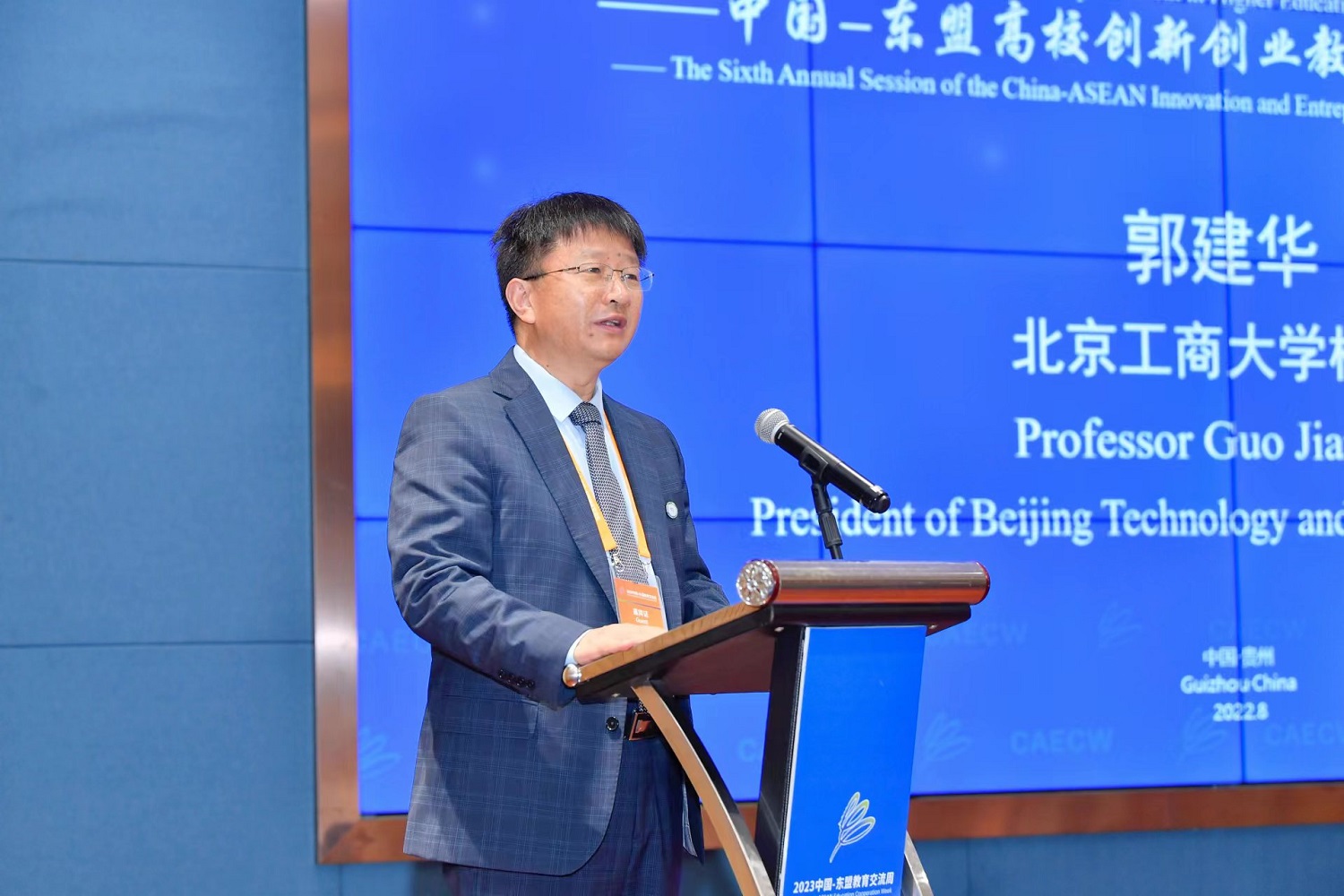 在开幕式上,郭建华代表主办方代表主办方致辞。郭建华表示,中国和东盟国家陆海相连,比邻而居,彼此人文相通、血脉相亲,友谊深厚。北京工商大学正在积极推进与东盟各国的深度交流与合作,推动与东盟国家在教育领域的高质量可持续的发展。本次论坛我们将“数字化赋能高等教育”这一主题与国内外高校、智库和企业界代表进行深入探讨和交流。围绕数智赋能与教育变革、数字变革时代高等教育的人才培养、数字化发展对人才培养的新要求、商科数字化转型等内容,从不同角度、不同层面、不同领域探讨教育数字化转型的最新进展、最佳实践和最有效策略,进而为教育数字化发展提供有益的借鉴与启示,为构建包容公平高质量可持续发展的智慧教育体系作出贡献。