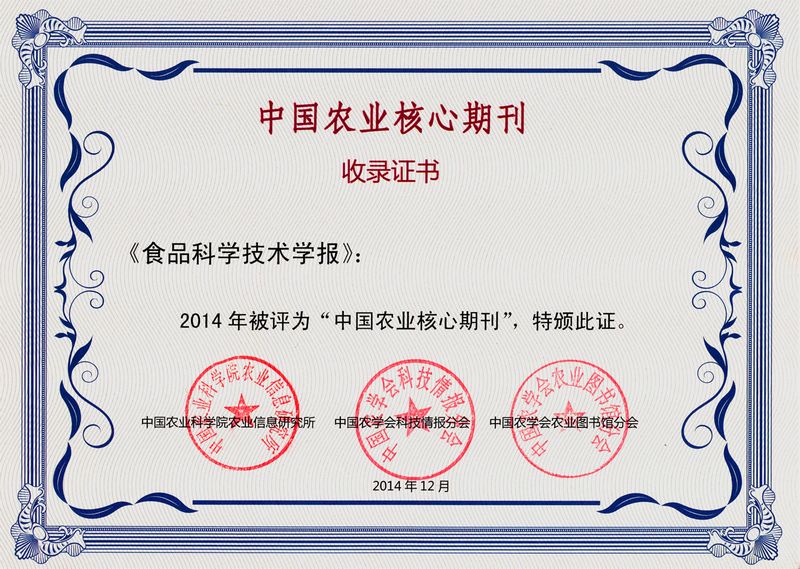 12月,由中国农业科学院农业信息研究所主持,联合中国农学会科技情报分会、中国农学会农业图书馆分会对我国911种农业科技期刊进行了评价,遴选出189种核心期刊,我校《食品科学技术学报》首次入选。