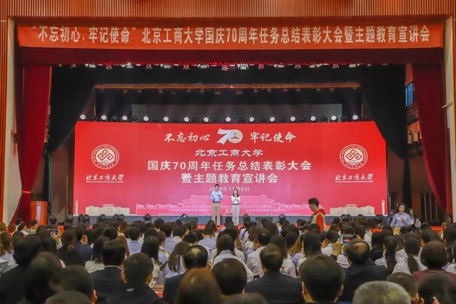 国青年报客户端讯(中国青年报·中国青年网记者 叶雨婷)11月6日下午,北京工商大学在良乡校区隆重举行“不忘初心、牢记使命”国庆70周年任务总结表彰大会暨主题教育宣讲会。国庆任务参与人员和服务保障人员、师生代表2000余人参加大会。