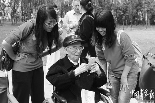5月19日,来自北京工商大学经济学院的青年志愿者让87岁的老华侨邵彤欣赏踏青时拍的照片。