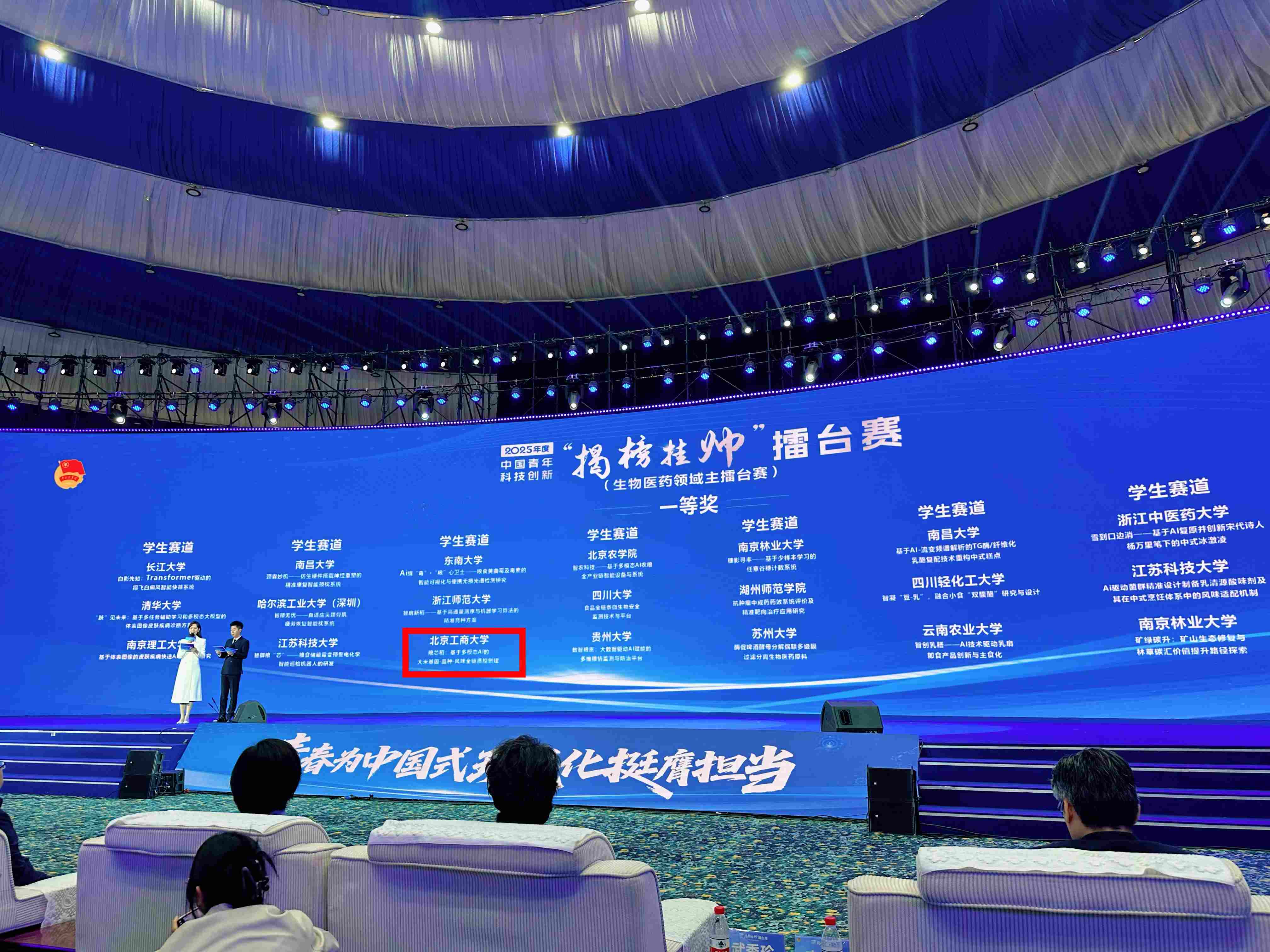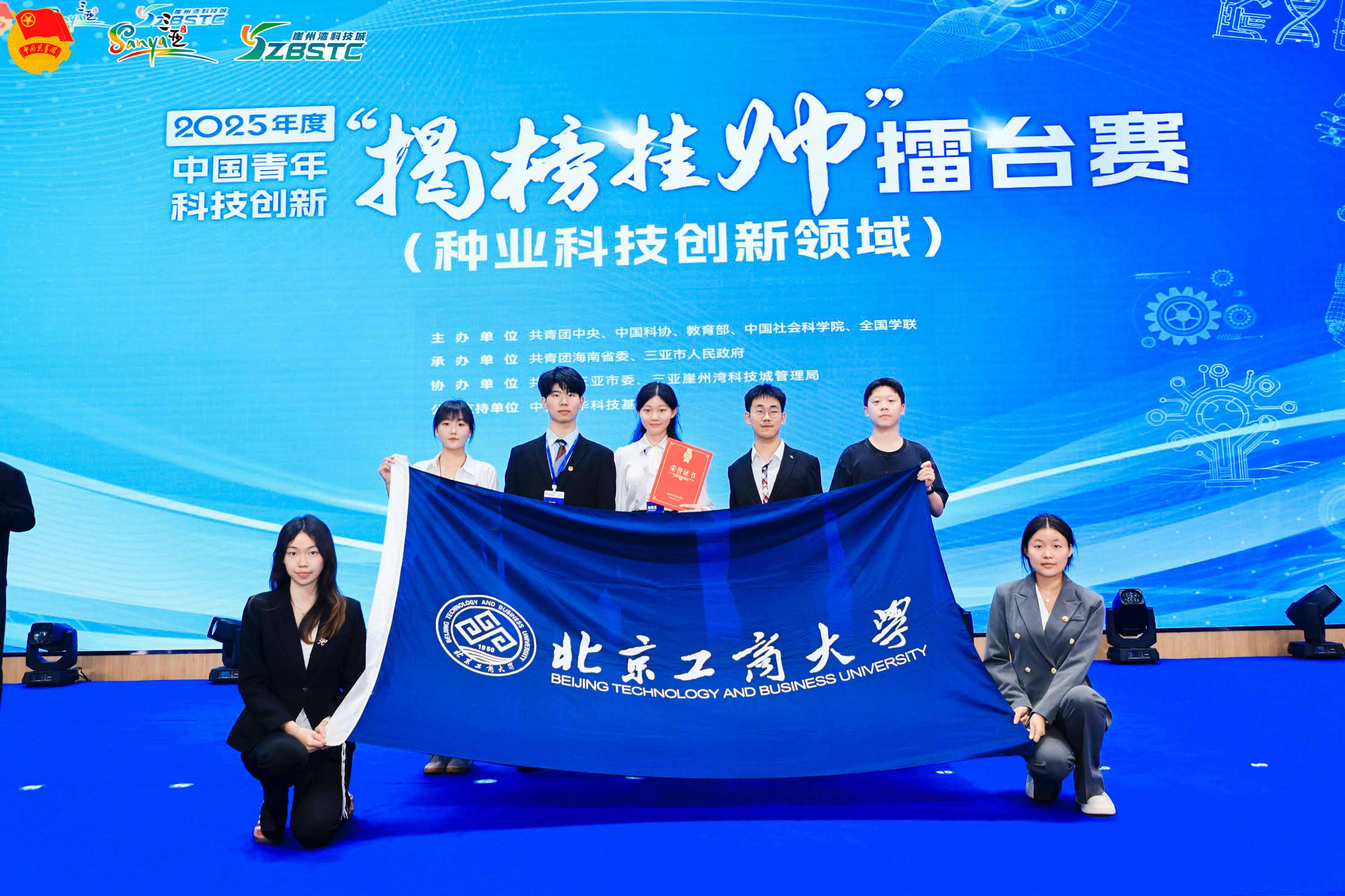 9月27日,在三亚崖州湾科技城举办的2025年度中国青年科技创新“揭榜挂帅”擂台赛“种业科技创新”领域主擂台赛中,有来自全国的71支青年科创团队同台竞技,围绕智慧农业、基因编辑、种质资源创新、水产育种等五大方向展开技术攻坚。我校团队凭借卓越表现,一举摘得擂主桂冠,并在颁奖典礼上作为擂主学生代表进行路演展示,向全国展现北工商智慧!