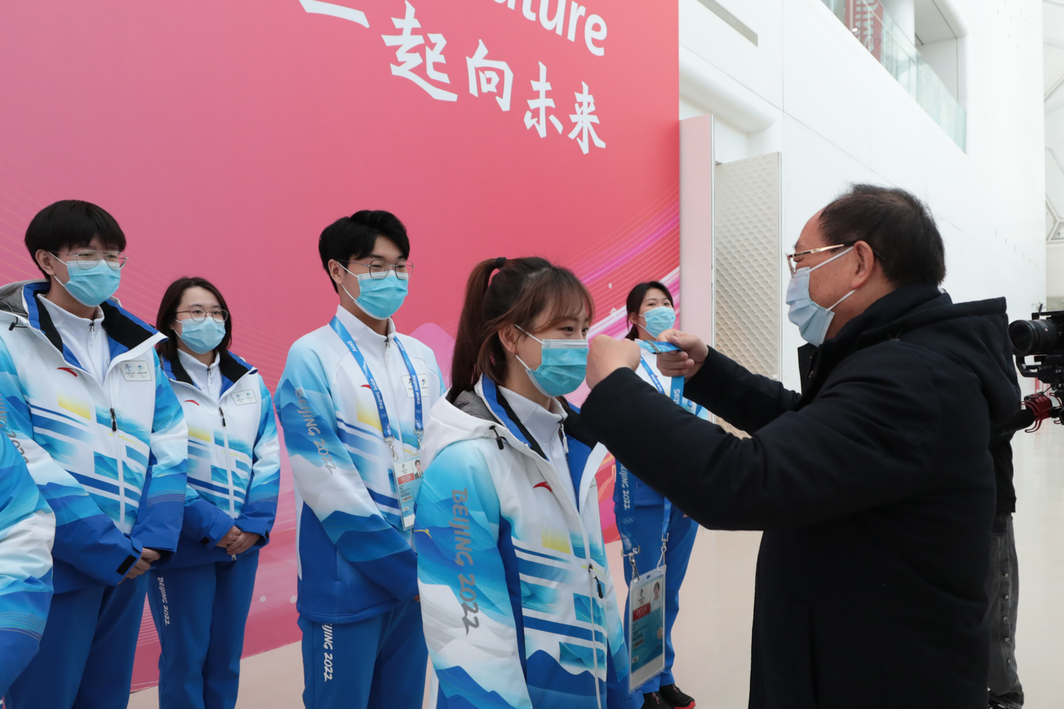 党委书记黄先开为志愿者佩戴工作证,一一了解志愿者所属院系,对志愿者的学习情况、课余生活表示关心,并强调做好志愿服务的首要前提是做好个人疫情防护。黄先开书记对学校志愿者们提出希望:一要珍惜北京2022年冬奥会和冬残奥会志愿服务工作的机会,坚守志愿岗位,把在学校掌握的理论知识、专业特长充分融入到冬奥会志愿服务实践工作中,以高标准,严要求完成好冬奥会志愿服务工作;二要继续发扬甘于奉献的优良传统,以昂扬的姿态、专业的服务,竭诚助力冬奥会服务保障,展现中国青年良好形象,用微笑和服务为奥运盛会注入工商学子靓丽的青春风采。