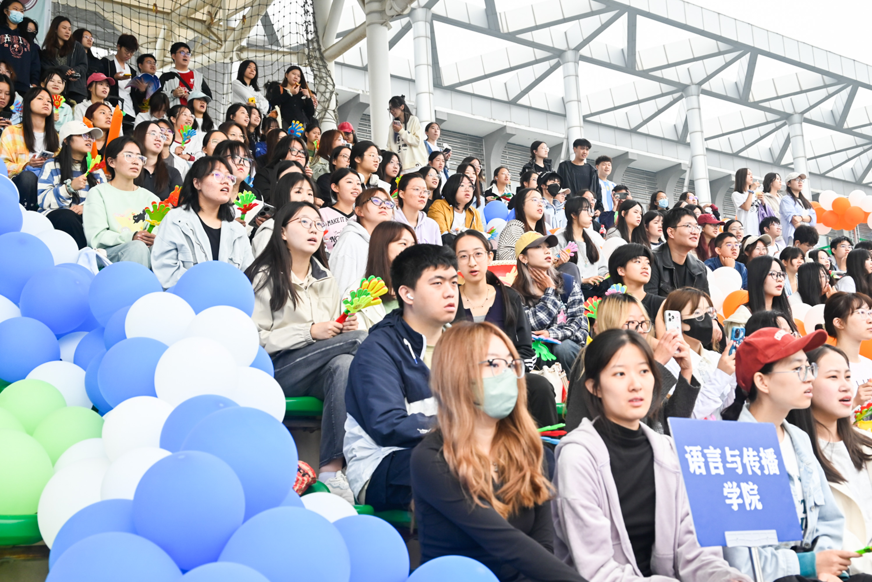 观众们在看台上喝彩欢呼,挥旗呐喊,笑容洋溢。热烈氛围渲染晴空。