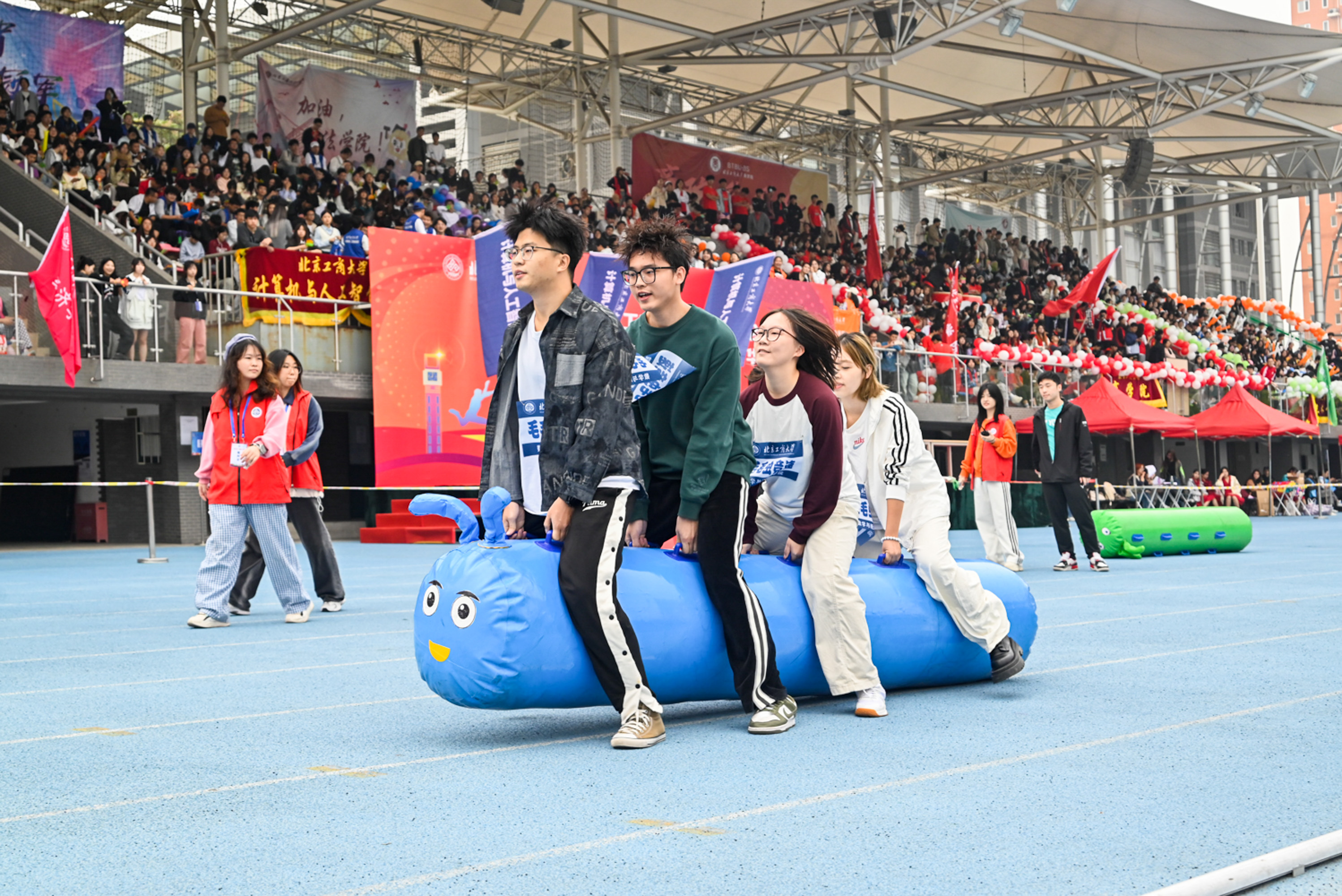 在趣味运动中,各学院运动员奋进拼搏、挥洒汗水,凝聚团队协作力量,绘制团结友爱的温暖画卷。