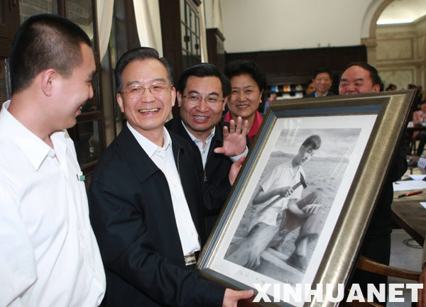 这是温家宝在校园里同学生们亲切握手。5月3日,中共中央政治局常委、国务院总理温家宝来到清华大学,与一批即将赴祖国西部和基层就业的清华大学应届毕业生代表座谈。 新华社记者 鞠鹏 摄