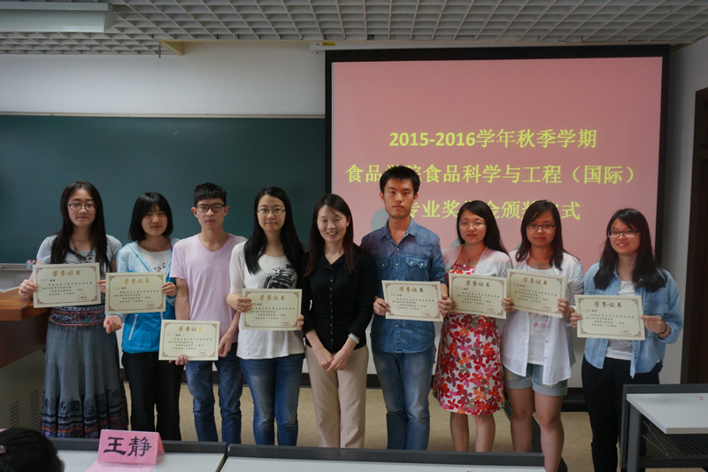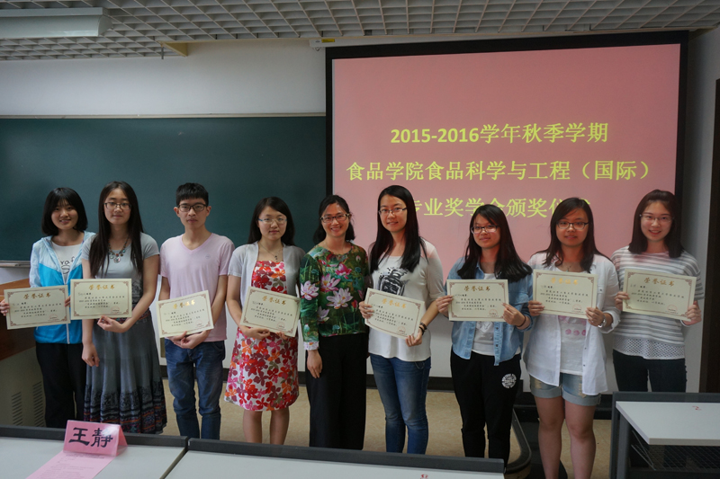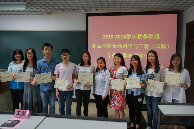 胡燕霞老师宣读了《2015-2016学年秋季学期食品学院食品科学与工程(国际)专业奖学金获奖学生名单》,在祝贺获奖同学的同时,告诫同学们戒骄戒躁、继续努力,在新的学期取得更加优异的成绩。随后,与会的各位领导和老师分别为优秀学生奖学金、专业课优胜奖学金、英语优胜奖学金、学业突出进步奖获奖学生颁奖。