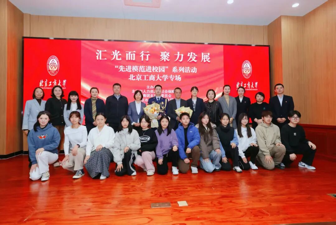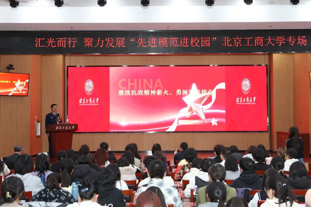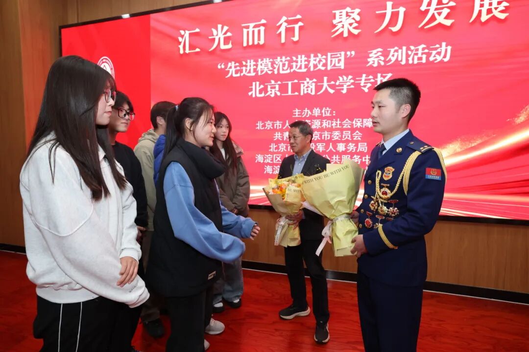 10月22日,由共青团北京市委员会、北京市人力资源和社会保障局、北京市退役军人事务局联合主办的汇光而行·聚力发展“先进模范进校园”北京工商大学专场活动圆满举行。本次活动以“传承和弘扬伟大抗战精神,践行新时代青年担当”为主题,特邀全国模范退役军人、门头沟区斋堂消防救援站副站长黄志川,北京市优秀退役军人、北京司雷植保科技有限公司董事长万佳,与师生面对面交流。他们以自身的奋斗经历,为青年学子树立榜样、指引方向,激励广大学子在新征程中勇担使命、奋发作为。
