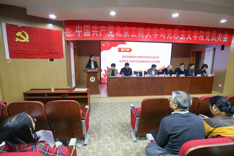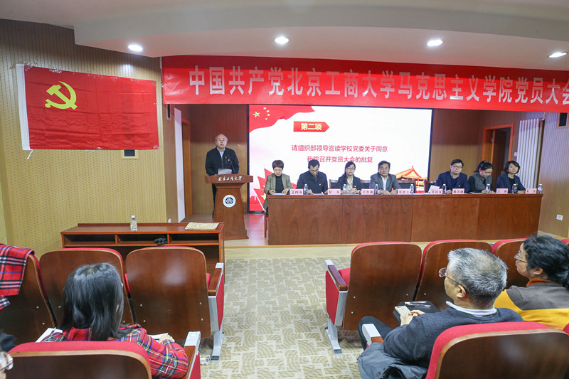 大会在庄严的国歌声中拉开帷幕。张国龙宣读了学校党委《关于同意中共北京工商大学马克思主义学院召开党员大会的批复》。