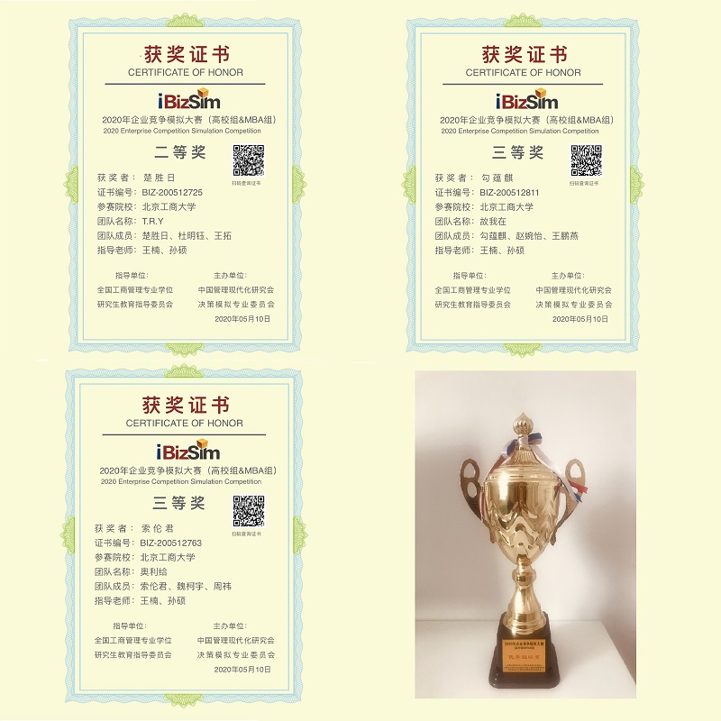 5月10日,2020年企业竞争模拟大赛(高校组&MBA组)落幕,我校MBA教育中心七支MBA队伍参赛,荣获一个二等奖,两个三等奖,指导教师王楠、孙硕荣获优秀指导奖,北京工商大学MBA教育中心荣获优秀组织奖。