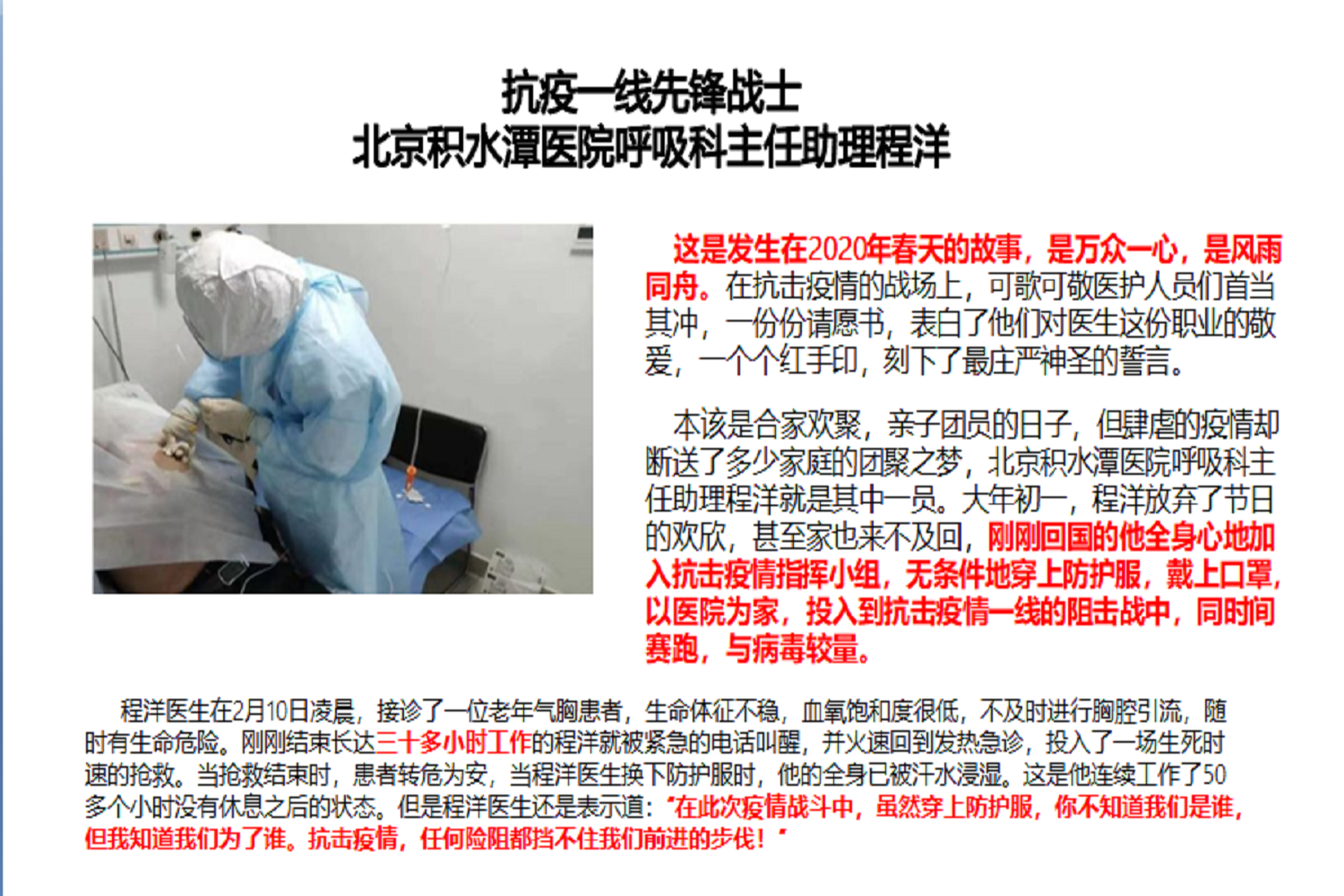 外国语学院商务英语17班以“抗疫情、讲故事、学精神”为主题开展班会,同学们回顾了疫情期间大家积极参与社区执勤、为湖北一线的医护人员募捐善款物资、制作为疫情发声主题作品10件、班级同学通过各种渠道为抗击疫情募捐善款共计1791元等抗疫故事。全班同学认真学习了抗疫一线先锋战士——北京积水潭医院呼吸科主任助理程洋医生的事迹,在抗击疫情的战场上,可歌可敬的医护人员们冲锋陷阵,这样的奉献精神深深感动了同学们,当代大学生应自觉把个人的理想追求融入国家和民族的事业中,奋发有为、勇敢担当。班会还特别连线了远在爱尔兰交换的苏英满和李曦,班级同学对他们的近况表示关心,两位同学表示由于目前还身处疫情比较严重的地区,一定会主动做好防护,在重视学业的同时也会照顾好自己的身体,永远记得背后有强大的祖国。