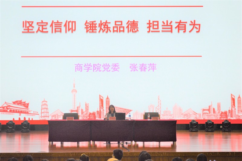 商学院党委书记张春萍为同学们讲授党课第一讲。她以“坚定信念、锤炼品德、争当先锋”为题,从理想与信仰、我们的新时代、青年的使命与担当、加强学习与实践四个方面,阐释了新时代青年如何坚定信念、锤炼品德、争当先锋。她谈到,信仰决定了人的价值取向,广大青年要把远大理想与社会责任结合起来,坚定信念、志存高远。抗疫取得的阶段性胜利充分彰显了中国共产党领导和我国社会主义制度的优势。新时代、新发展,我国进入了新的发展阶段,迈向新的奋斗目标,青年学生要肩负起时代赋予的光荣使命。她带领同学们学习了抗疫英雄模范的事迹,回顾了习近平总书记近年来对青年学子的殷切寄语,着重解读了党的十九届五中全会精神的重要意义、“十四五”时期发展目标和2035年远景目标、四个全面的新表述以及国家新时代的发展战略等,强调要认真学习贯彻党的十九届五中全会精神,增强责任感,立足发展所需,学以致用,努力成为堪当国家改革发展重任的栋梁之材。张春萍寄语学子,要“勇做走在时代前面的奋进者、开拓者、奉献者”,扣好人生的第一粒扣子。她引用习近平总书记在中央党校中青年干部培训班开班式上讲话中勉励年青干部要具有的七种能力,请同学们对照自己做过的一项工作总结收获,明确自己的能力和目标,并走入同学中间与同学们进行互动。最后,张春萍对入党积极分子提出殷切希望:希望同学们注重品德修养,沉潜学习,勇于创新,保持乐观坚毅,培养勤劳自律,勇于担当有为,加强学习与实践,做知行合一的新青年。
