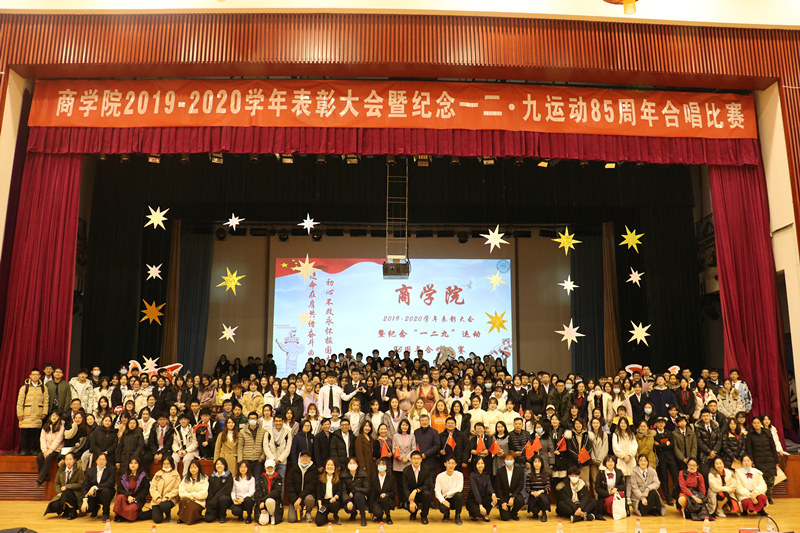 为弘扬爱国精神,增强班级凝聚力,丰富校园文化生活,12月6日,商学院在良乡校区举办2019-2020学年表彰大会暨纪念“一二·九”运动85周年合唱比赛。商学院党委书记张春萍,党委副书记张倩,副院长孙永波、张伟华,组织员祁飞,团委书记赵杰,全体2020级班主任、辅导员,以及2020级本科生以及受表彰学生代表参加了本次活动。邀请校团委曹璐婷、体育与艺术教学部孙凯、丁璇担任评委。