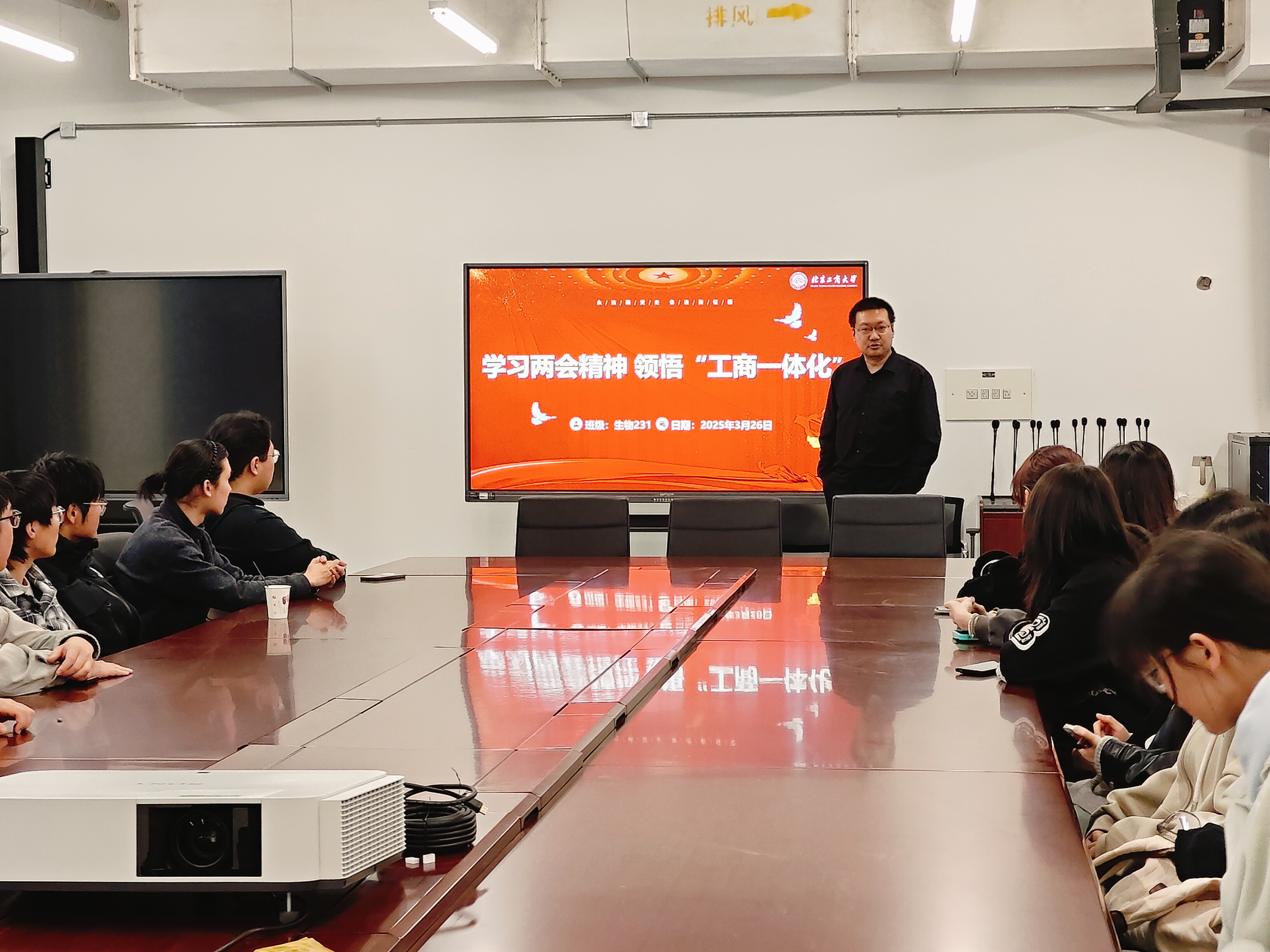 为深入学习贯彻2025年全国两会精神,全面了解我校“工商一体化”发展理念,学生处组织各学院全覆盖开展“学习两会精神,领悟‘工商一体化’”主题班会。