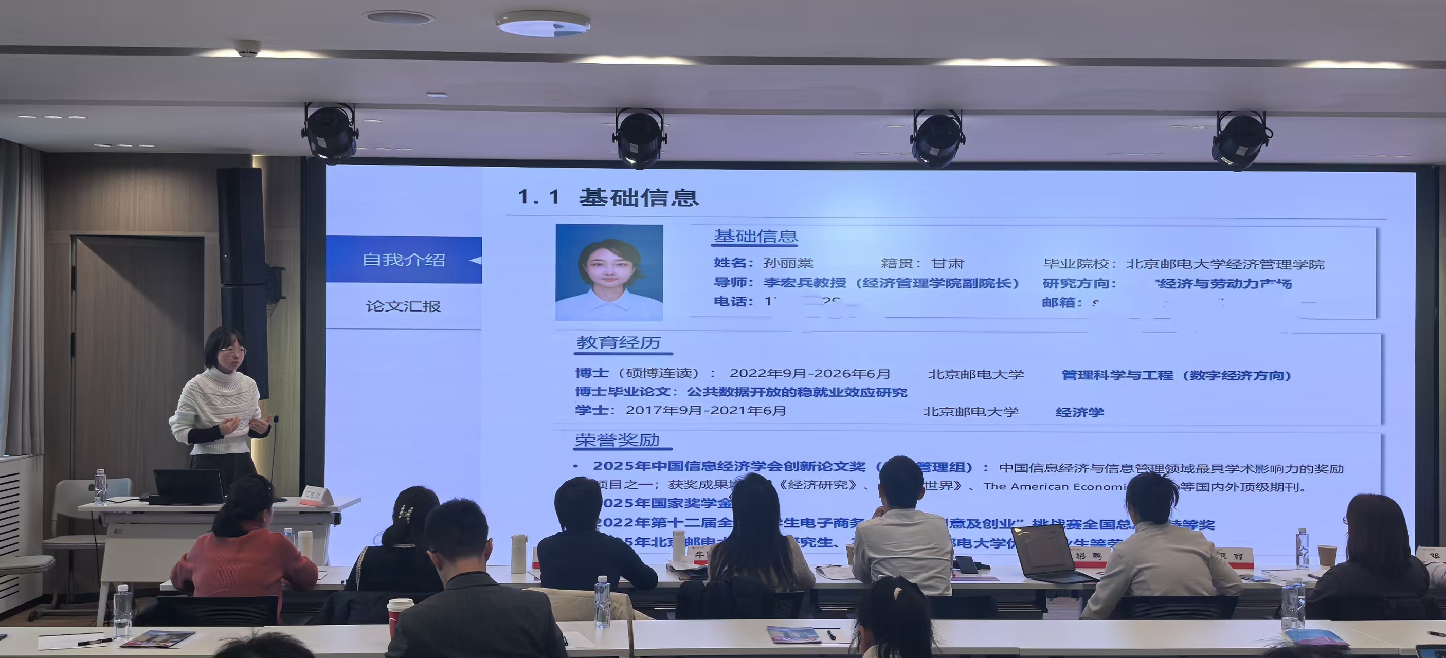 北京邮电大学经济管理学院孙丽棠博士报告了论文“公共数据开放与企业数字劳动需求”。论文通过整理上市公司在线招聘职位数据,构建公共数据开放指标体系,研究发现公共数据开放通过增加企业数据任务需求,提高企业数字基础设施投资,形成数字新职位创造和工作任务数字化,提升数字劳动需求。该结论对加强公共数据汇聚共享、加快数字中国建设和促进高质量充分就业具有重要政策参考价值。