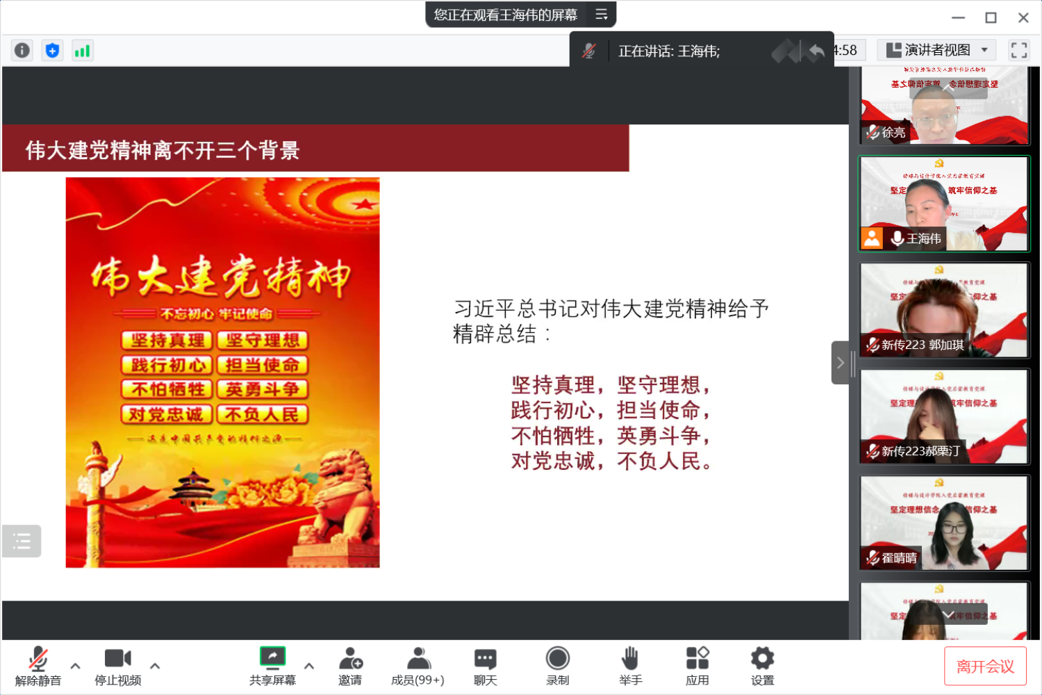 党课围绕赓续红色血脉、弘扬建党精神、坚定理想信念、筑牢信仰之基四个方面展开。王海伟以习近平总书记在庆祝中国共产党成立100周年大会上的重要讲话引出共产党人的精神长河和精神高地,通过带领同学们重新学习雷锋同志和当代雷锋郭明义同志的先进事迹,指出精神力量具有传承性,以电影《我和我的祖国》中钱学森同志的故事指出精神力量具有引领性,长征精神、抗疫精神彰显出精神力量具有聚合性,引导同学们从伟大精神中汲取奋进力量。王海伟带领同学们回顾了党史一百年发展历程中的四次伟大飞跃。通过讲述伟大建党精神的背景,深刻阐述了马克思主义赋予了其明确的革命基调,伟大建党活动赋予了其厚重的实践。结合杨靖宇同志、焦裕禄同志、抗美援朝等典型案例阐述课伟大建党精神的科学内涵,教育同学们不忘来时路,常怀感恩心。