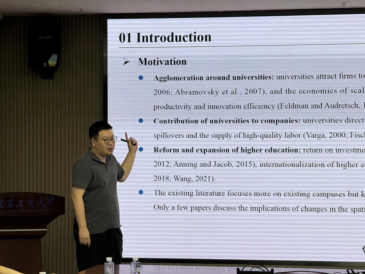 张凡老师报告了论文“More than a new campus: University's spatial expansion, emerging knowledge cluster, and innovation growth”。通过空间计量模型和双重差分(新校区建设冲击)的方法,研究了大学空间扩张对区域创新的影响。得出大学扩张通过知识溢出效应促进周边创新集群形成,效应在理工科院校更显著的结论。随后,汪念玲教师点评建议需验证机制(如产学研合作),建议分析政策配套(如人才引进)的调节作用。