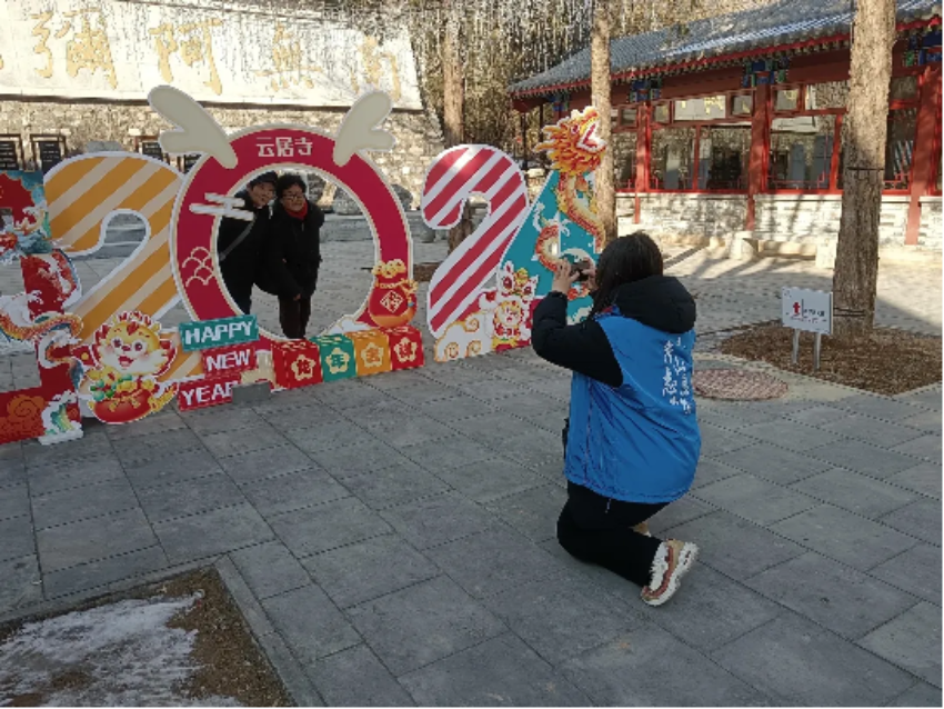 志愿者们主要负责在景区现场协助游客扫码登录“一键游房山”小程序进行景区游览注册,以及注册码核销、道路引导、信息咨询等服务工作。我校志愿者司雨首次参加本次活动,她十分荣幸能够在人杰地灵的云居寺参与志愿服务,帮助来到房山的游客们参与各种非遗民俗文化活动。志愿者们每天服务约七个小时,帮助游客扫码预约登记、引路指南,他们在寒风中身着“房山志愿者”队服的“志愿蓝”,在服务的过程中组成了一道靓丽风景线。他们热情地迎接每一位游客,在志愿服务期间始终听从指挥、服从安排、团结协作,为游客提供了全面周到细致的服务,提高了游客的体验感和幸福感。