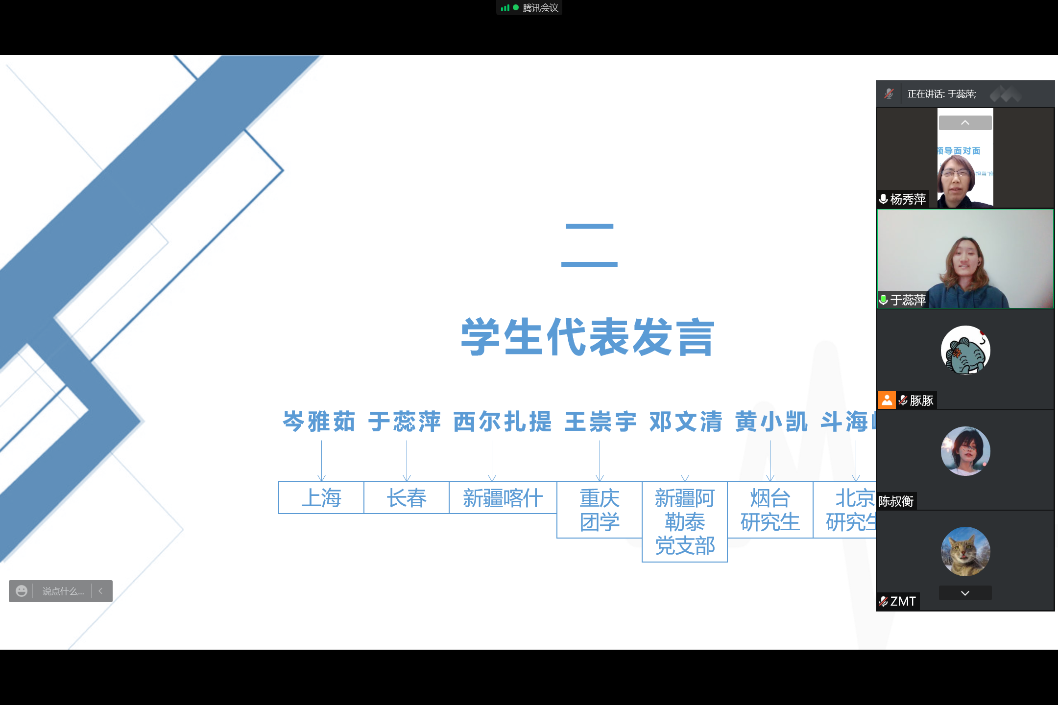 本次座谈会邀请了家住上海、吉林、新疆、山东等地的学生代表,有少数民族学生、学生干部、学生党员等。大家介绍了目前所在地区的疫情形势、居家学习的情况,也表达了同心抗疫的决心。家住上海的岑雅茹表示,第一次切身感到疫情离自己这么近,这期间能够努力保持良好的心态,配合社区做好防疫工作,在家认真上好网课,并积极备战考研。家在吉林长春的于蕊萍作为青志协代表和疫情地区代表发言,她非常感谢老师和同学们的关心和帮助,这很大程度上缓解了自己的心理压力。也感谢全国各地对长春的援助,希望能尽快战胜疫情,回到校园学习和生活。王崇宇作为团干部代表发言,他表示,学院会在近期推出一系列学团史的活动,希望各班学生骨干做好榜样,带领班上的同学认真学习每一期的团史和青年大学习的内容。邓文清作为党员代表发言,他表示,今年以来党支部的各项工作安排虽然受到疫情影响,但还是积极应对困难和挑战,定期开展各项活动和工作,居家学习期间,建议同学们在保证安全的情况下多出门散散步,进行一定的体育锻炼。期待尽快与大家在校园相遇!”家在新疆的维吾尔族学生代表西尔扎提说:“隔着两个小时的时差每天坚持上课,虽然辛苦,但也在不断适应,远隔千里,但在线上相聚,很期盼早日返回美丽的校园,与老师和同学们相聚。”因科研任务已经返校的研究生斗海峰表示:“每天过着三点一线的生活,实验室、食堂、宿舍,虽然单调,但也充实,学校各方面保障还是很到位的,大家都在期盼着疫情早日过去,学习和生活回到正轨。”