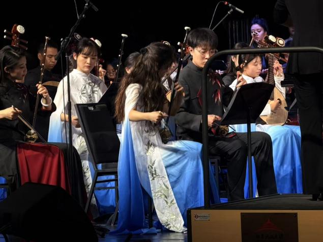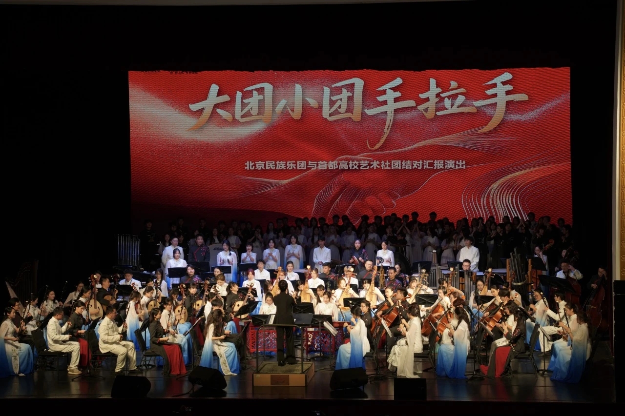近日,由北京市委宣传部、市委教育工委指导,北京民族乐团主办的“大团小团手拉手”北京民族乐团与首都高校艺术社团结对汇报演出在民族文化宫大剧院精彩落幕。此次演出既是2025年“‘京’彩文化·青春绽放”行动计划的重要组成部分,也是首都文化资源推动青年学生参与全国文化中心建设的重要实践,我校民乐团作为首都高校代表受邀参演。在指导教师刘兆的带领下,我校民乐团以精湛技艺演绎《我的祖国》《龙腾虎跃》等经典作品,并在观众热烈掌声中返场加演《花好月圆》,赢得现场观众热烈掌声。