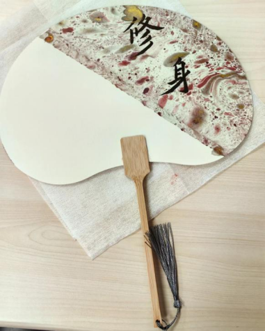 在社团社员的的指导下,在场学生党员分工协作,分组制作漆扇。“修身”“自省”“廉洁”“明德”……大家纷纷用笔墨在空白扇子上书写所思所感所愿,继而在水漆中或平入、或旋转、或轻摇,铺在纸上静待晾干,一柄柄典雅明丽、独一无二的漆扇制作完成,握在手中,阵阵清风在盛夏时节拂面而来。