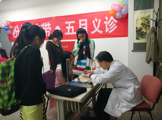 5月12日、13日,校研会青志协举办了以“粉红丝带·五月关爱”为主题的系列活动。活动共分为乳房健康知识宣传和健康义诊两部分。 在活动宣传中,来咨询的同学络绎不绝,工作人员一边分发宣传手册,一边指导报名参加义诊活动。同学们很积极,纷纷前来报名咨询,大家的热情还吸引了来自哈萨克斯坦和非洲地区的朋友。宣传结束后,协会成员还专门为打印店、小卖部、书店的阿姨和楼管阿姨送去了义诊邀请。每天都为学业生活忙碌的我们,有机会也不要忘记停下脚步多多关心自己的身体。 义诊现场,邀请到了海军总医院王海龙主任、李易霞主任和校医院王彤医生为我校师生进行女性健康义诊。三位医生很耐心地微笑倾听并回答了前来看诊的每一个同学的问题。医生们的热心和真诚令大家感动,在短短的三个小时里就有84位同学前来咨询问诊,同学们对我们本次义诊活动相当满意,并夸赞说很用心很有意义。 本次活动秉着青志协“让志愿融入生活”的理念宗旨,不仅鼓励全校师生多多关注身体健康,更是用实际行动展现了奉献、友爱的志愿者精神,激发了同学们从事公益的热情和积极性。