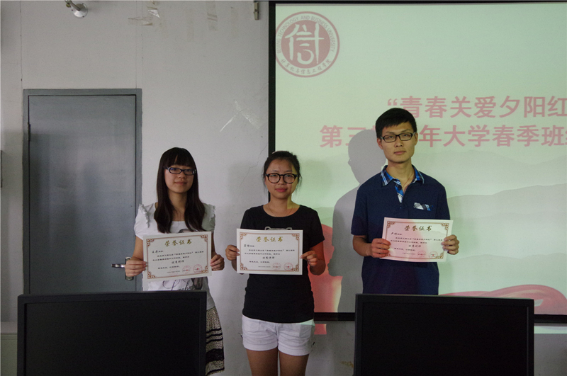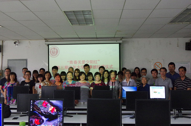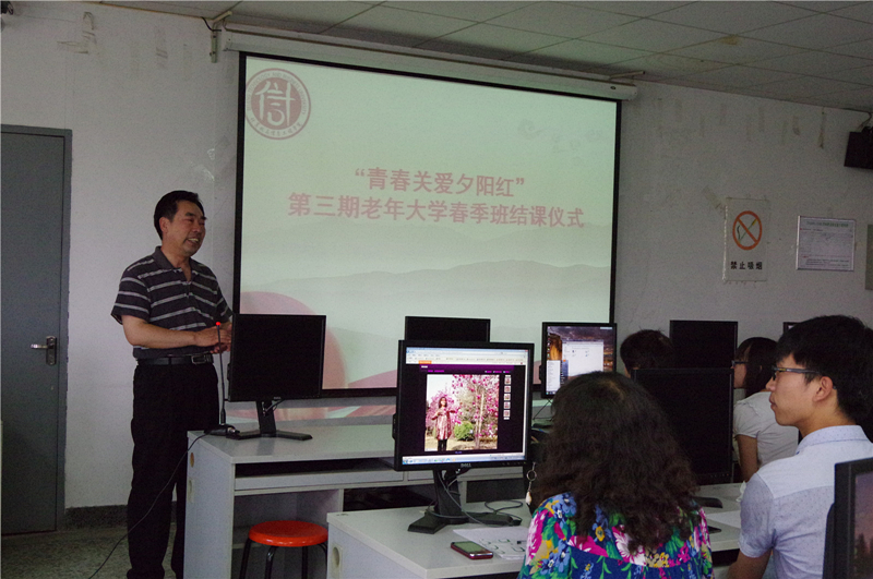 6月3日,由计信学院、离退休工作处、网络中心联合举办的 “青春关爱夕阳红”老年大学2015年春季班的最后一讲暨结业仪式在阜成路校区进行。离退休党总支书记庞春生、计信学院党总支副书记张凯伟及学生党员讲师、助教、老教师学员参加了结业仪式。