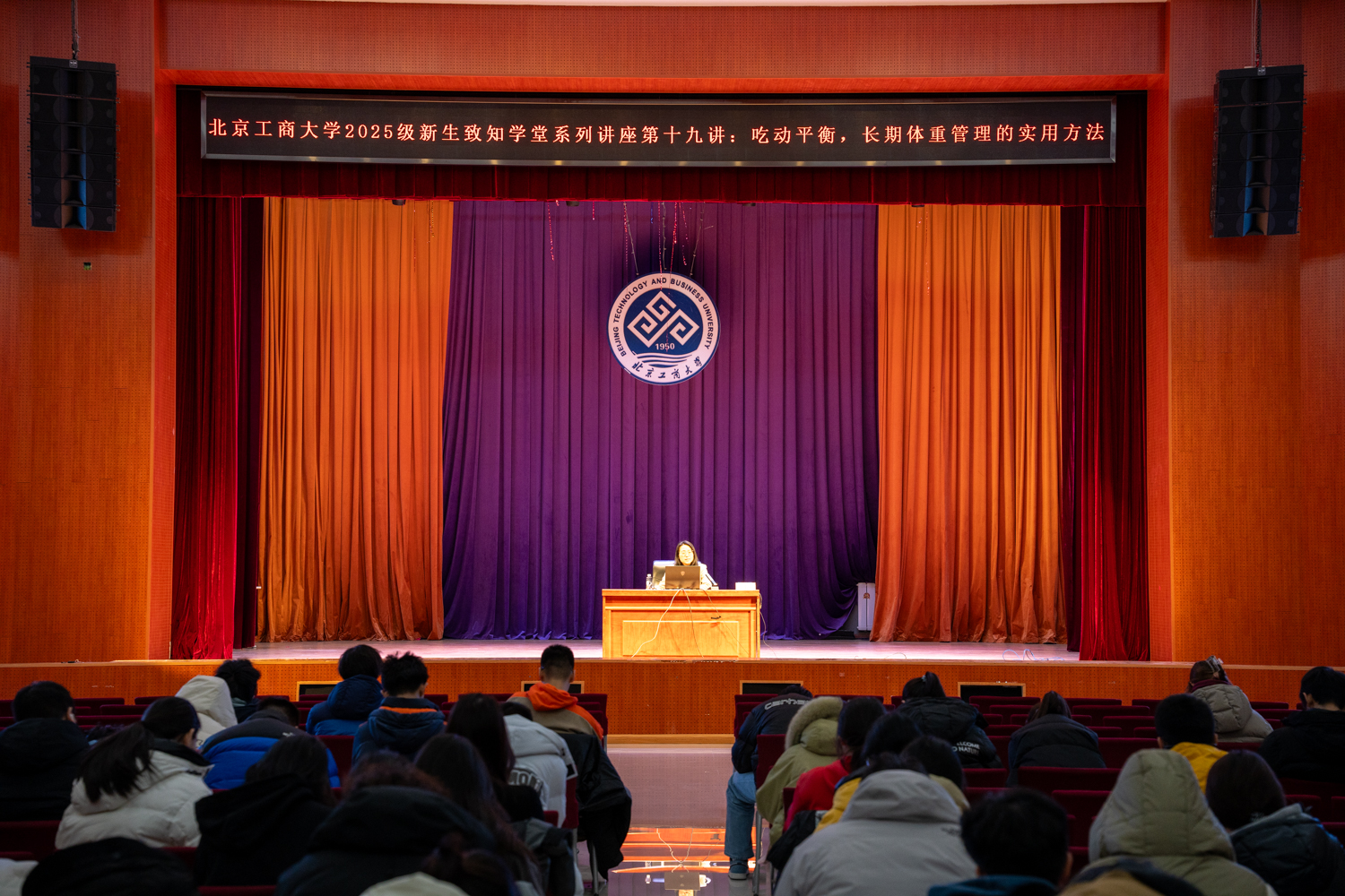 12月23日,北京工商大学在阜成路校区举行2025级新生“致知学堂”系列讲座第十九讲:吃动平衡,长期体重管理的实用方法。北京市体育科学研究所副研究员孙金秋围绕体重管理的科学标准、能量平衡原理、合理膳食与科学运动等内容展开分享,帮助学子树立科学的体重管理理念,掌握健康生活的实用方法。