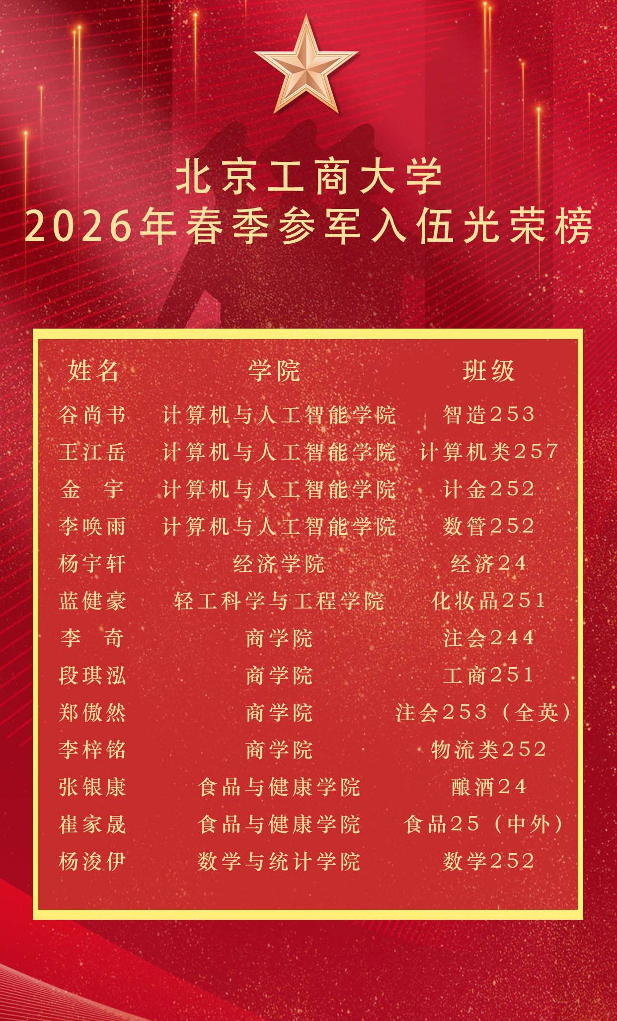 每个人的青春里,都藏着一颗炽热的报国心。从凝望军徽,到整装待发。他们把赤诚刻进心底,把担当扛在肩头。这个春天,北工商学子以青春之名,赴戎光之约,携笔从戎,矢志国防,用青春热血书写无悔人生。