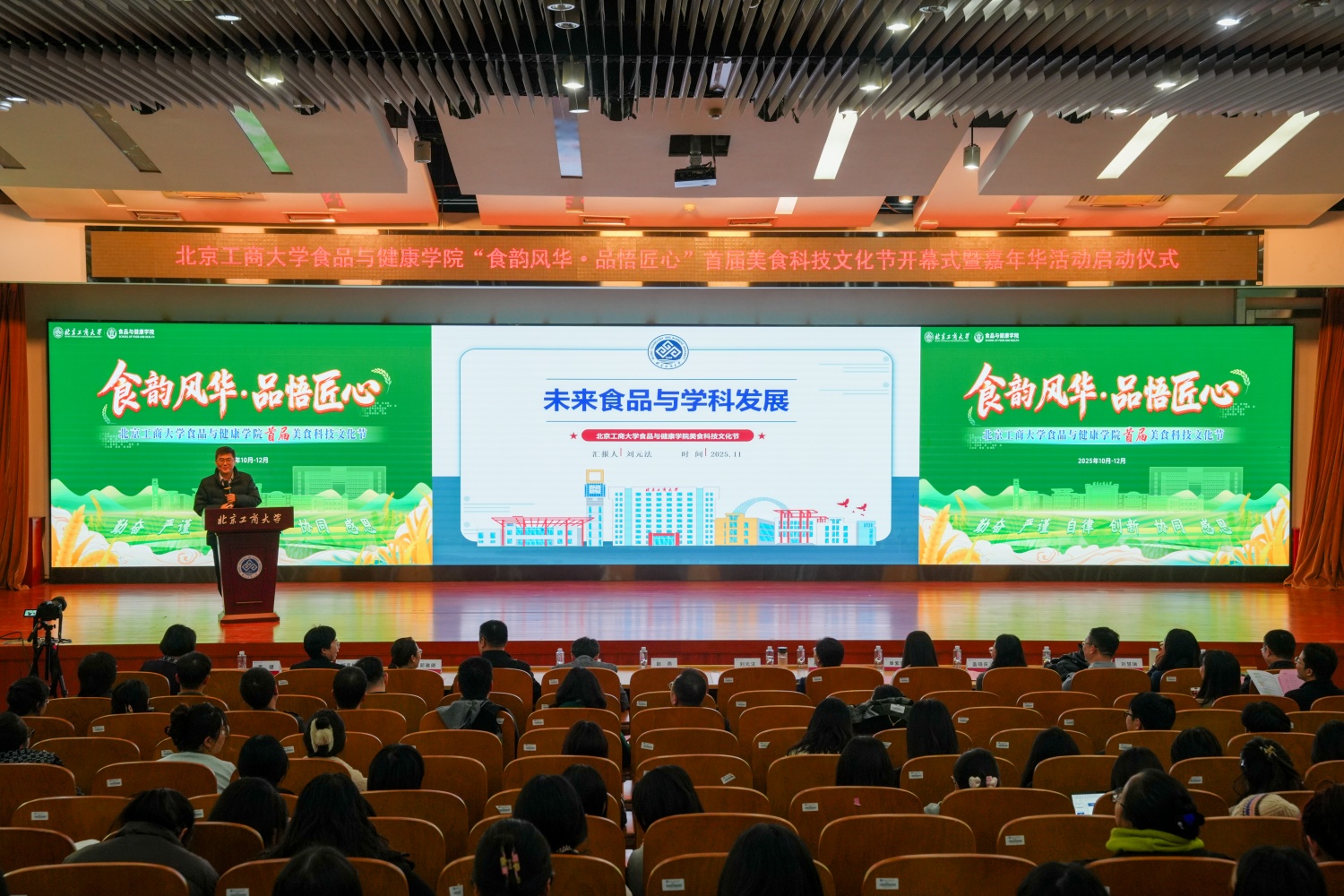 11月5日,食品与健康学院“食韵风华・品悟匠心” 首届美食科技文化节开幕式暨嘉年华活动启动仪式在良乡主校区学术报告厅举行。来自北京食品科学研究院、中国食品药品企业质量安全促进会、北京同仁堂健康药业股份有限公司、同仁堂药酒厂、北京北冰洋食品有限公司、北京神州味业科技有限公司等特邀行业和校友嘉宾,学校发展规划处处长刘元法、招生就业处处长石松、团委书记单紫薇、教务处副处长盖晓庆、学院全体领导、各系党支部书记、系主任、教师代表、辅导员及在校本研学生300余人齐聚一堂,共同见证活动启幕,仪式由学院党委副书记熊慧主持。