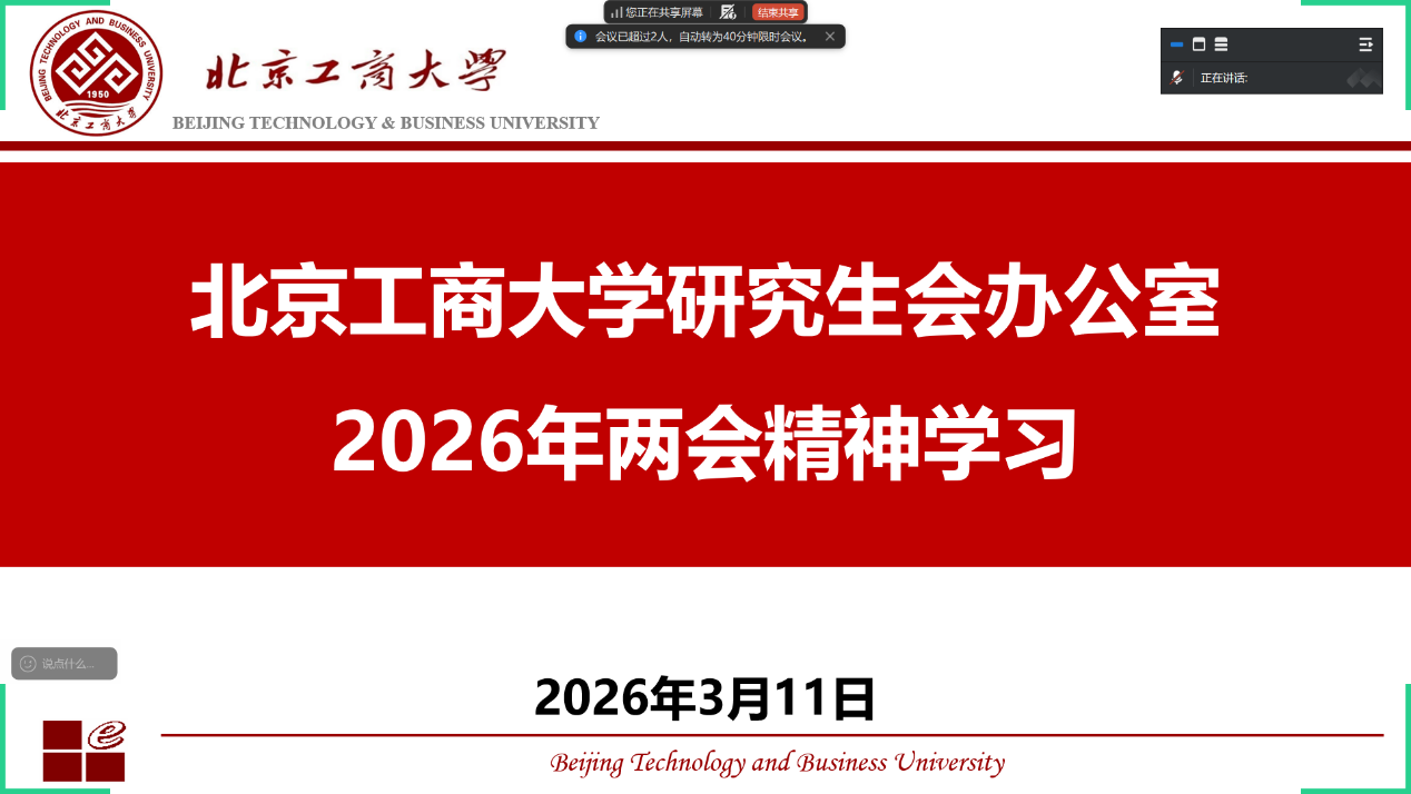 为深入学习贯彻2026年全国两会精神,引导广大研究生准确把握核心要义、统一思想行动,党委研究生工作部于2026年3月统筹组织全体研究生开展专题学习活动。本次活动紧扣“十五五”开局之年的战略定位,持续深化“自学—互学—共学—践学”四维一体学习体系,推动理论学习与专业深耕、国家需求深度融合,在提升政治认同的同时,进一步强化研究生的使命担当与行动自觉。