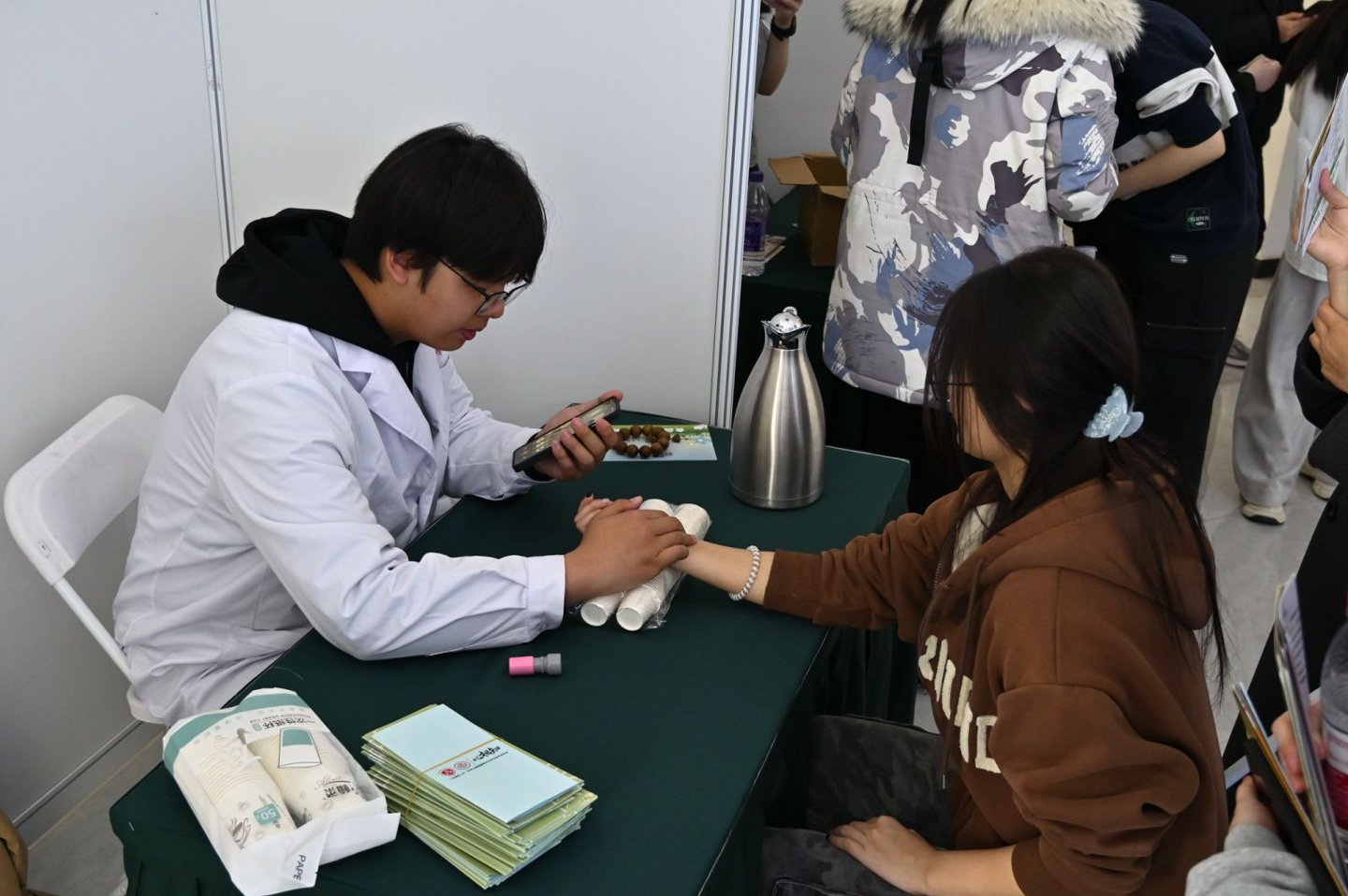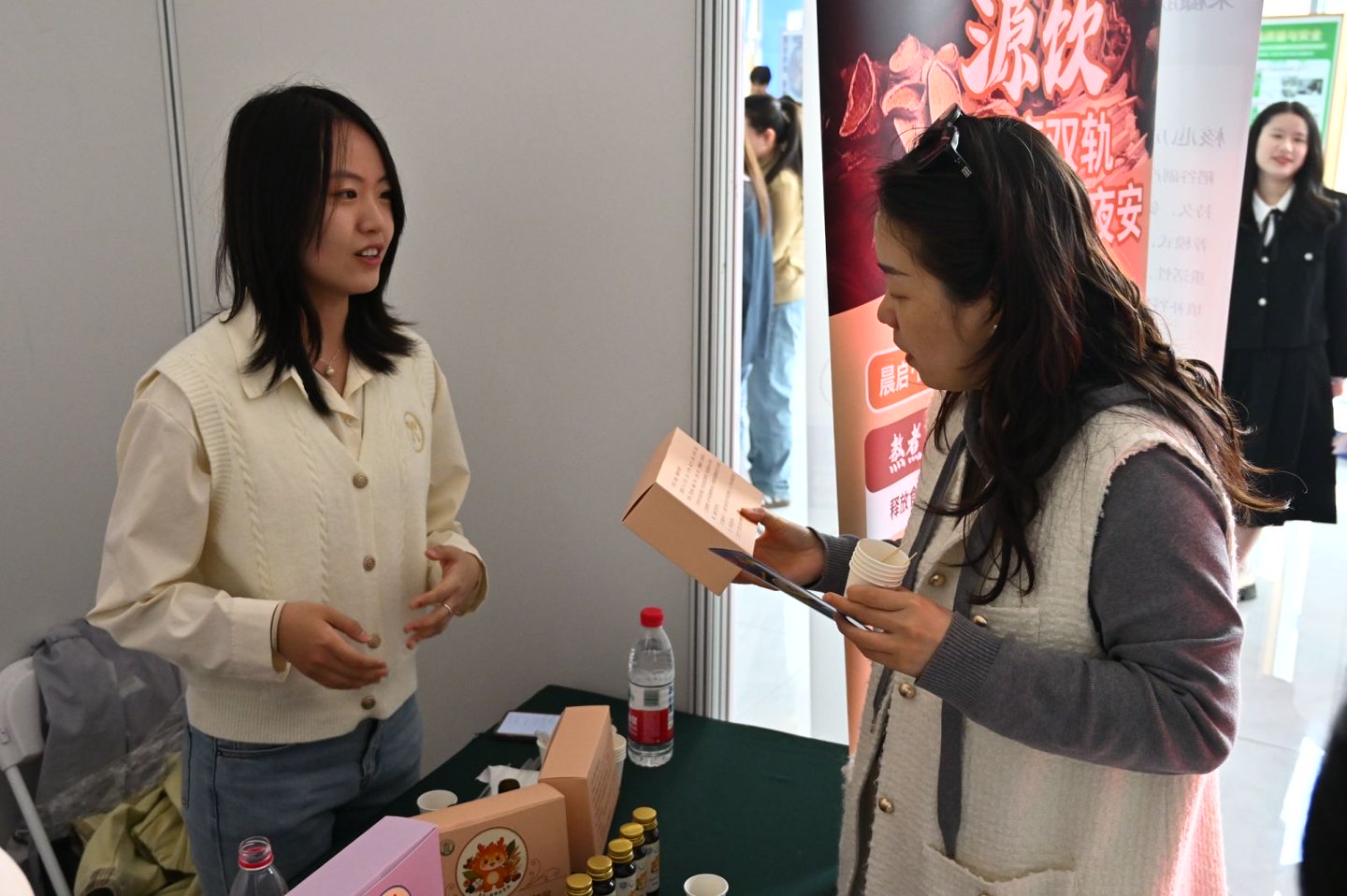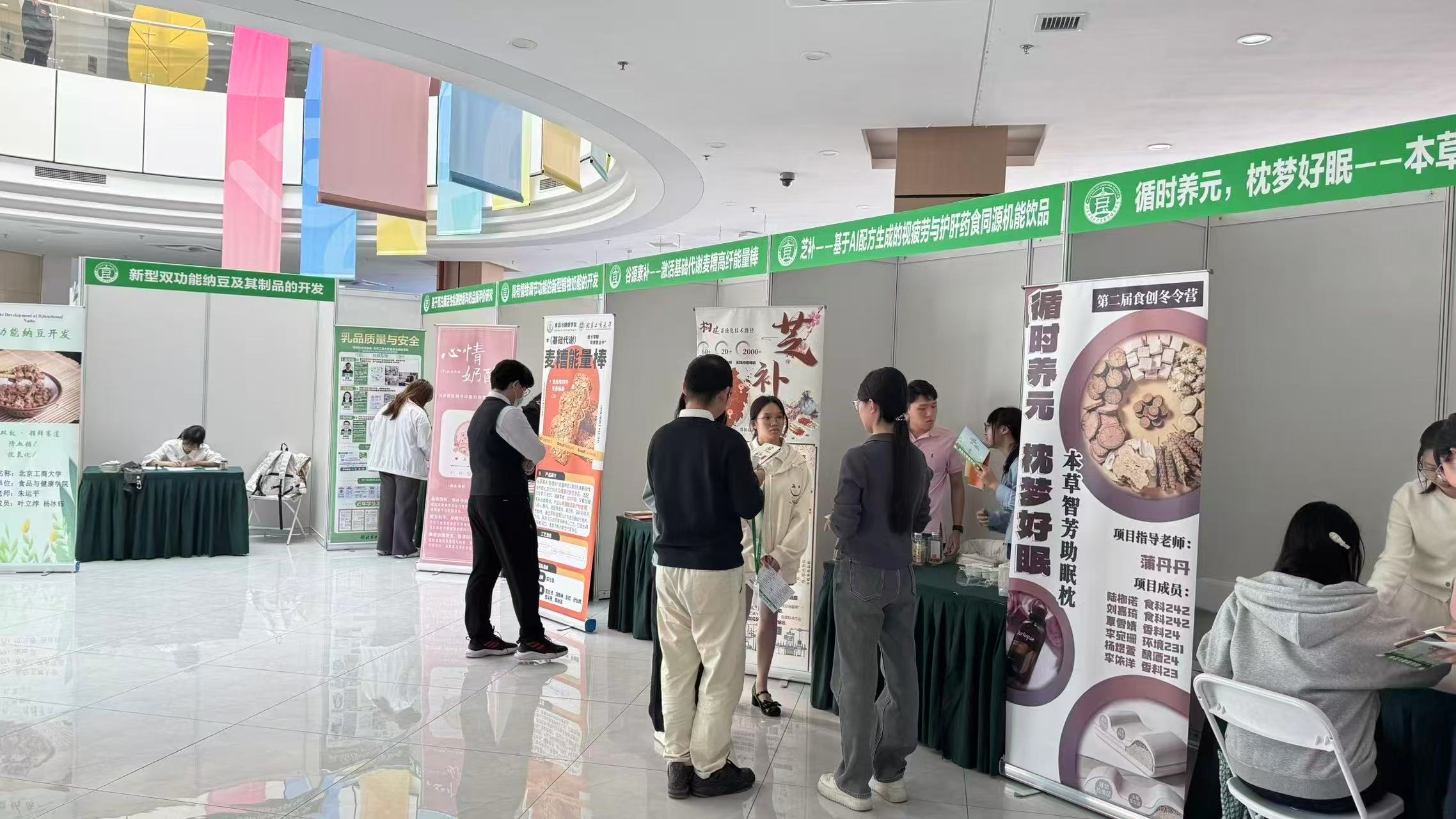本届科创日活动以食创冬令营成果为依托,共推出25个科创项目,来自全校8个学院的124名本硕博学生参与其中,1个项目来自北京中医药大学中医学院,院外学生占比约20%,首次实现科创活动跨校联动,推动中医药、人工智能与食品健康跨学科融合,体现了“工商一体化”专业交叉融合的鲜明特色。各团队聚焦食品科技创新与产业应用,以实物展示、互动体验、动态演示等形式,全面呈现项目创新点、科学性与产业化前景。评审专家们巡看展台实物,分别围绕技术落地、市场转化、产业适配等维度逐一点评,为项目优化提供专业指导。