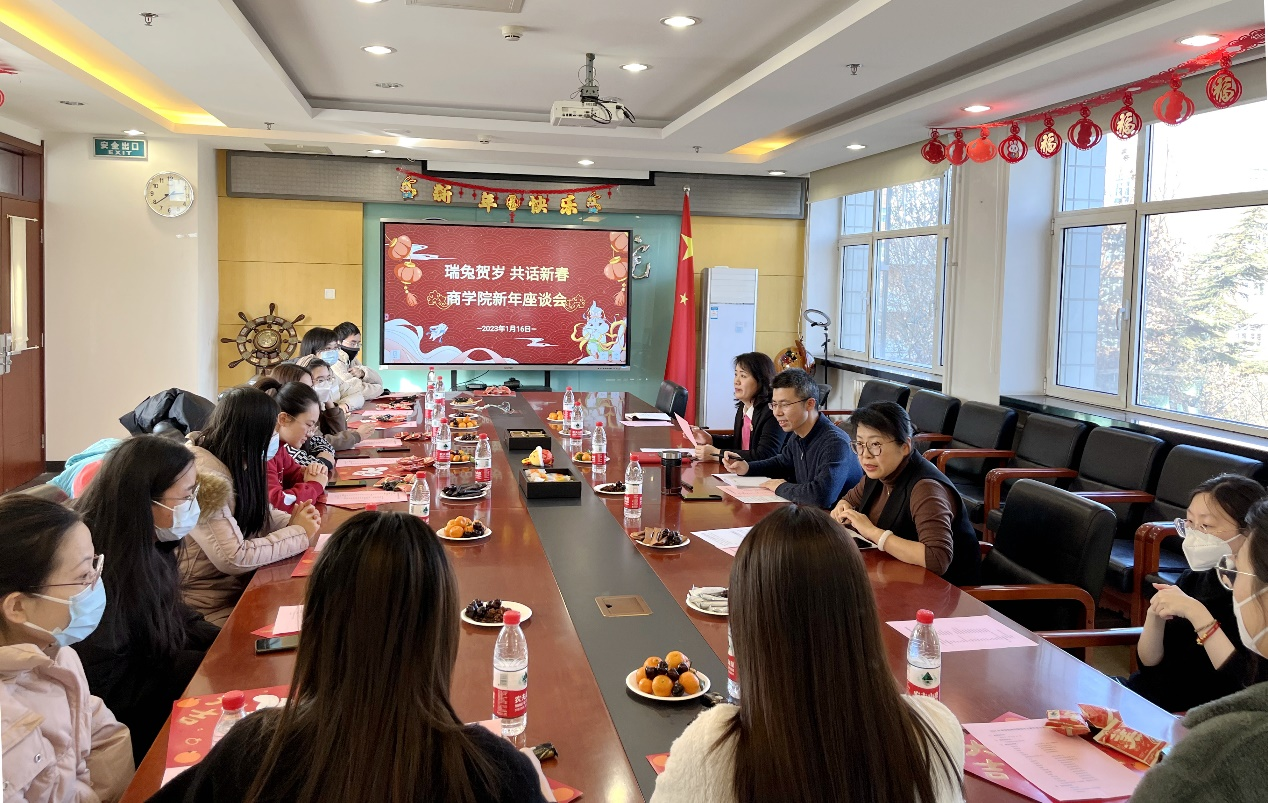 共话新春、共享祝福,献计发展、共促成长。1月16日下午,商学院组织寒假留校过节学生举行“瑞兔贺岁 共话新春”迎新春座谈会。学院党委书记张春萍、学校研究生院院长兼商学院院长毛新述、学院党委副书记张倩、辅导员马珂、张欣宇及12名留校过节本、硕、博学生参加座谈会。会议由学院党委副书记张倩主持。
