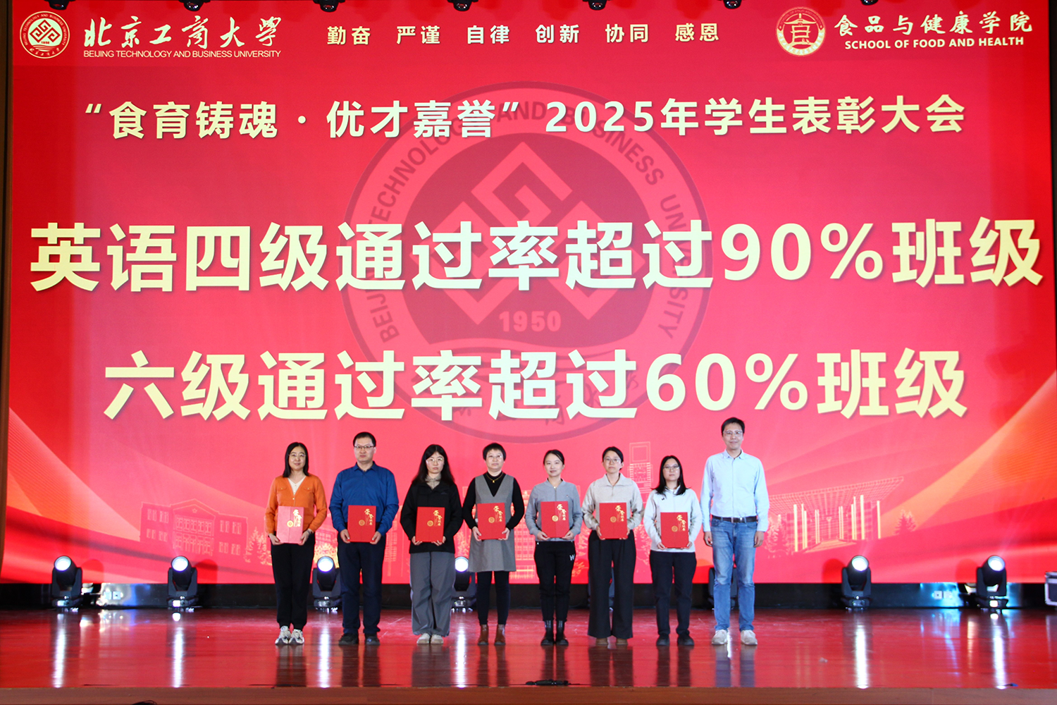 在颁奖仪式环节,钟捷、严江、寇红江、单紫薇、许朵霞、王少甲、熊慧等嘉宾和领导分别为钟香驹奖学金、味食源奖学金获得者,本科升学率和就业率前三班级,英语通过率超过90%、六级通过率超过60%班级,院级优秀班主任,校级优秀党支部、十佳优良学风班、十佳学霸宿舍、优秀社会实践团队,以及学科竞赛国赛获奖团队及导师代表颁奖表彰,激励师生以榜样为范、砥砺前行。