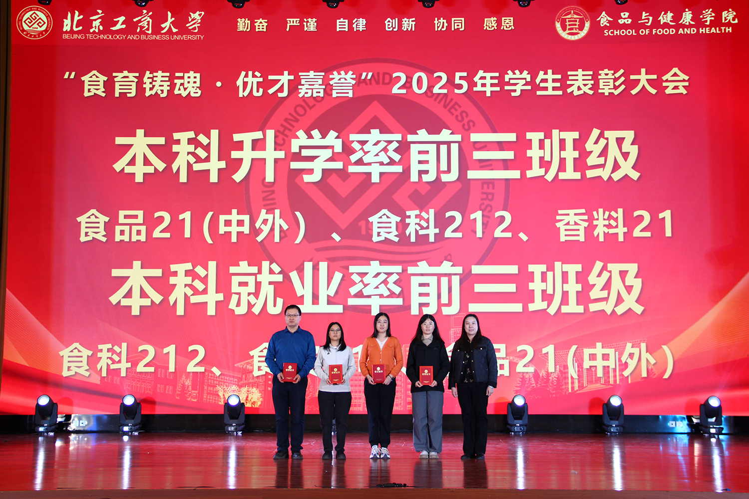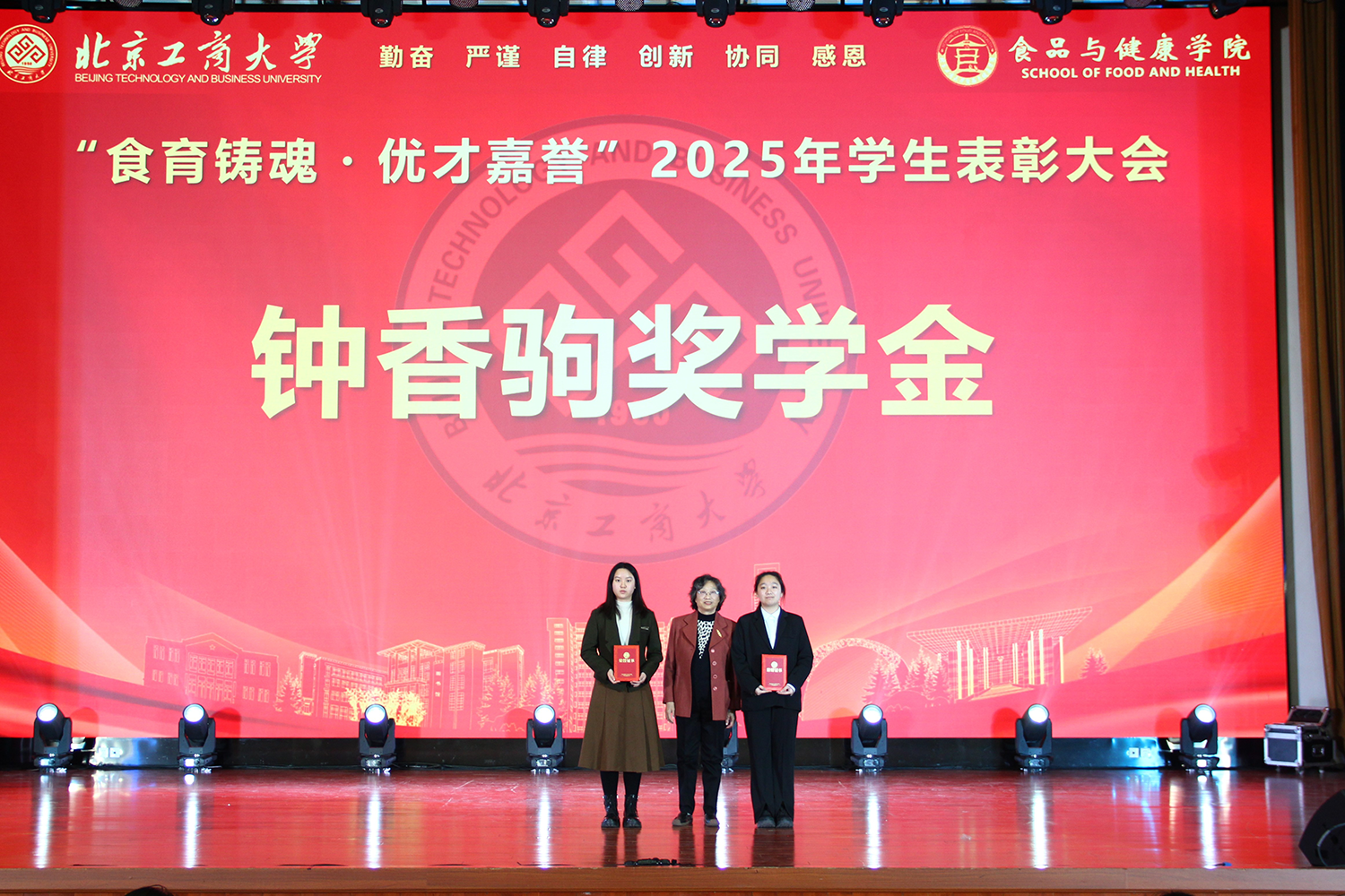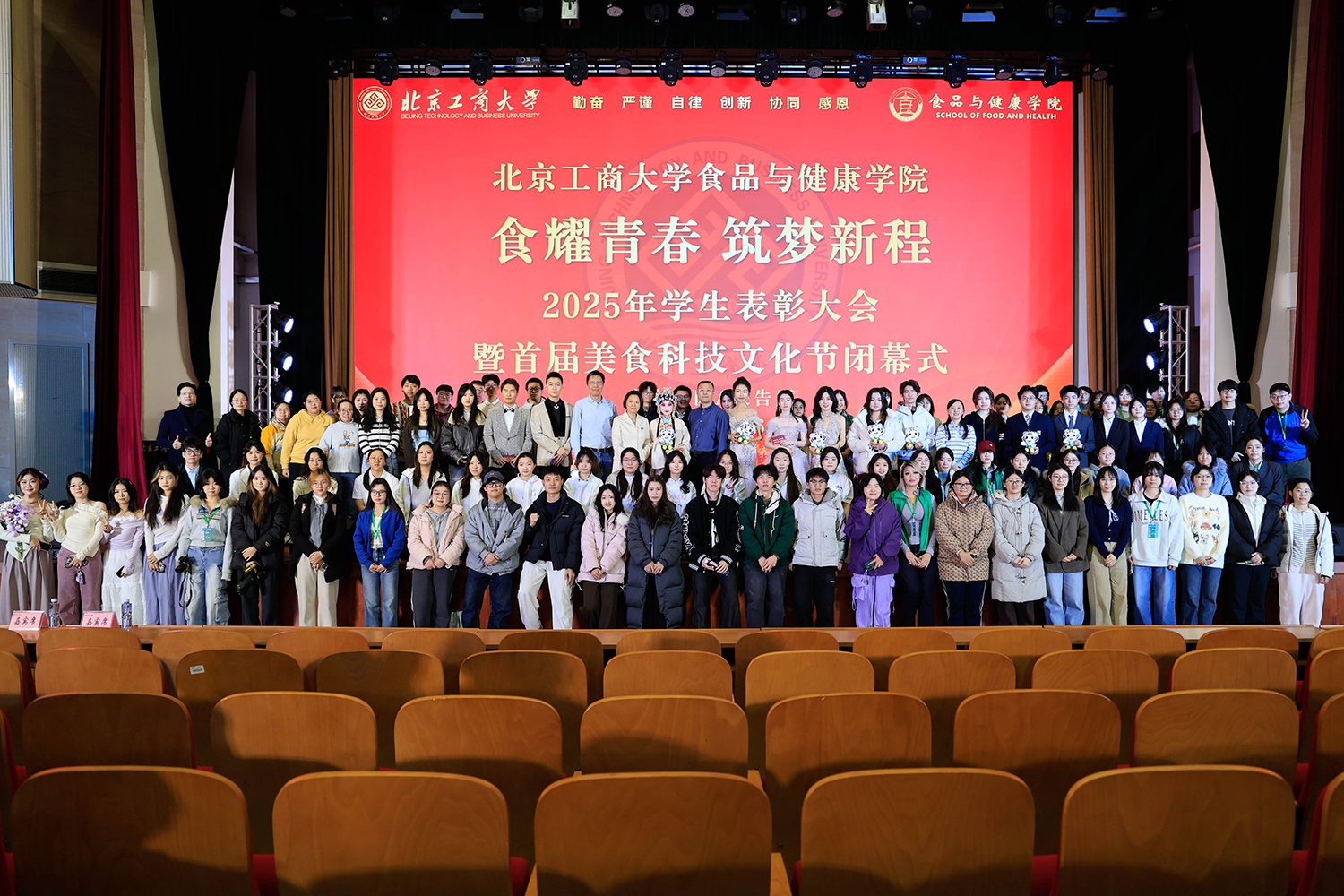12月6日,食品与健康学院在良乡校区隆重举行“食耀青春 筑梦新程”2025年学生表彰大会暨首届美食科技文化节闭幕式。学校党委常委、副校长寇红江,学校团委书记单紫薇,学院特邀嘉宾味食源奖学金管理方代表、北京味食源食品科技有限公司董事长助理兼研发总监严江,钟香驹奖学基金管理人、钟香驹教授之女钟捷,中融百鸣投资管理集团有限公司董事长陶庆,北京康安利丰农业有限公司党支部书记、副总经理乔雪静,北京藻辰生物科技有限公司创始人杨阳,北京首朗生物科技有限公司常务副总经理李重阳,北京康比特体育科技股份有限公司产品开发中心总监王冬,食品与健康学院领导班子、各系主任以及教师代表、班主任代表、辅导员、学生代表齐聚一堂,共同见证学院人才培养成果,表彰先进典型。