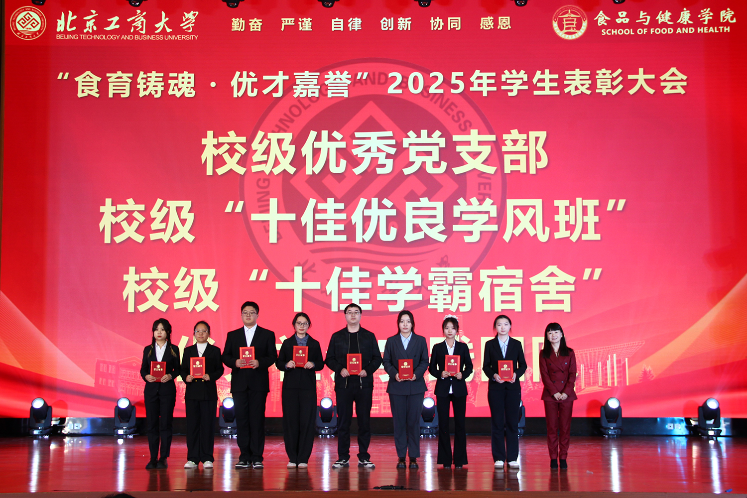 大会播放了食品与健康学院学生工作年度总结视频,视频展现了学院育人工作的扎实成效,彰显学院对培养高质量食品科技人才的努力和成果。院长王彦波宣读表彰决定,对优秀个人与集体予以肯定,希望他们再接再厉,积极进取;希望其他同学以他们为榜样,不负众望,争取成为新的黑马。