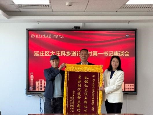 大庄科乡纪委书记程飞、霹破石村党支部书记杨忠云分别向学校赠送锦旗,表达对北京工商大学、对向小平同志两年多来倾力帮扶、助力乡村振兴的诚挚谢意,学校组织部副处级组织员张巍、经济学院党委书记张春萍接受锦旗。锦旗上镌刻的字样不仅承载着乡、村两级对帮扶工作的高度认可,更凝聚着校地同心携手、共促乡村振兴的深厚情谊。