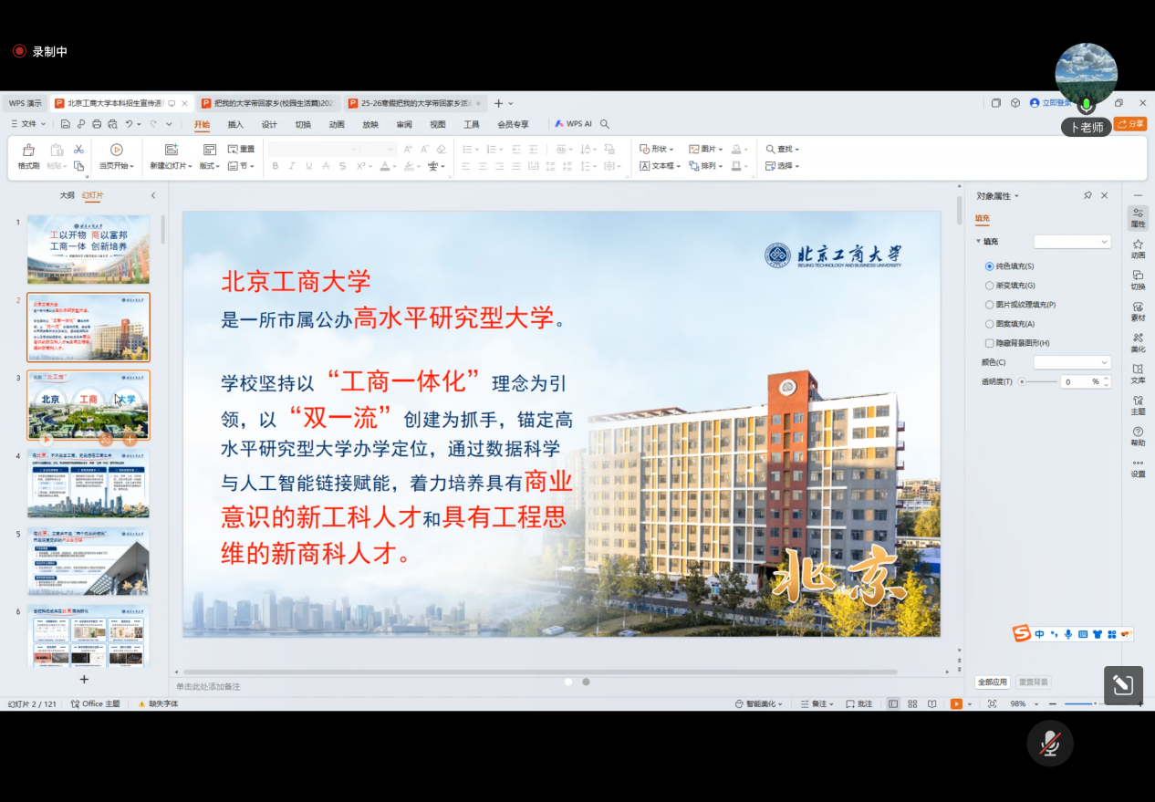 招生宣传实践汇报环节同样精彩纷呈。经济学院李赛鑫、食品与健康学院宋颖两位研究生分别分享了赴肥乡区第一中学、滕州市第一中学的宣讲经历。两位同学从前期对接、宣讲筹备到现场互动、后期反馈进行全面复盘,用北工商研究生自己的语言,向高三学子深情讲述学校发展奋进的故事。通过情感共鸣、专业讲解与互动答疑,传递我校“工商一体化”办学特色与学科优势,不仅让北工商的形象在高中师生心中更加立体鲜活,更实现了自身沟通表达、统筹规划能力的全面提升,获得母校高度认可,真正实现了“双向奔赴”。