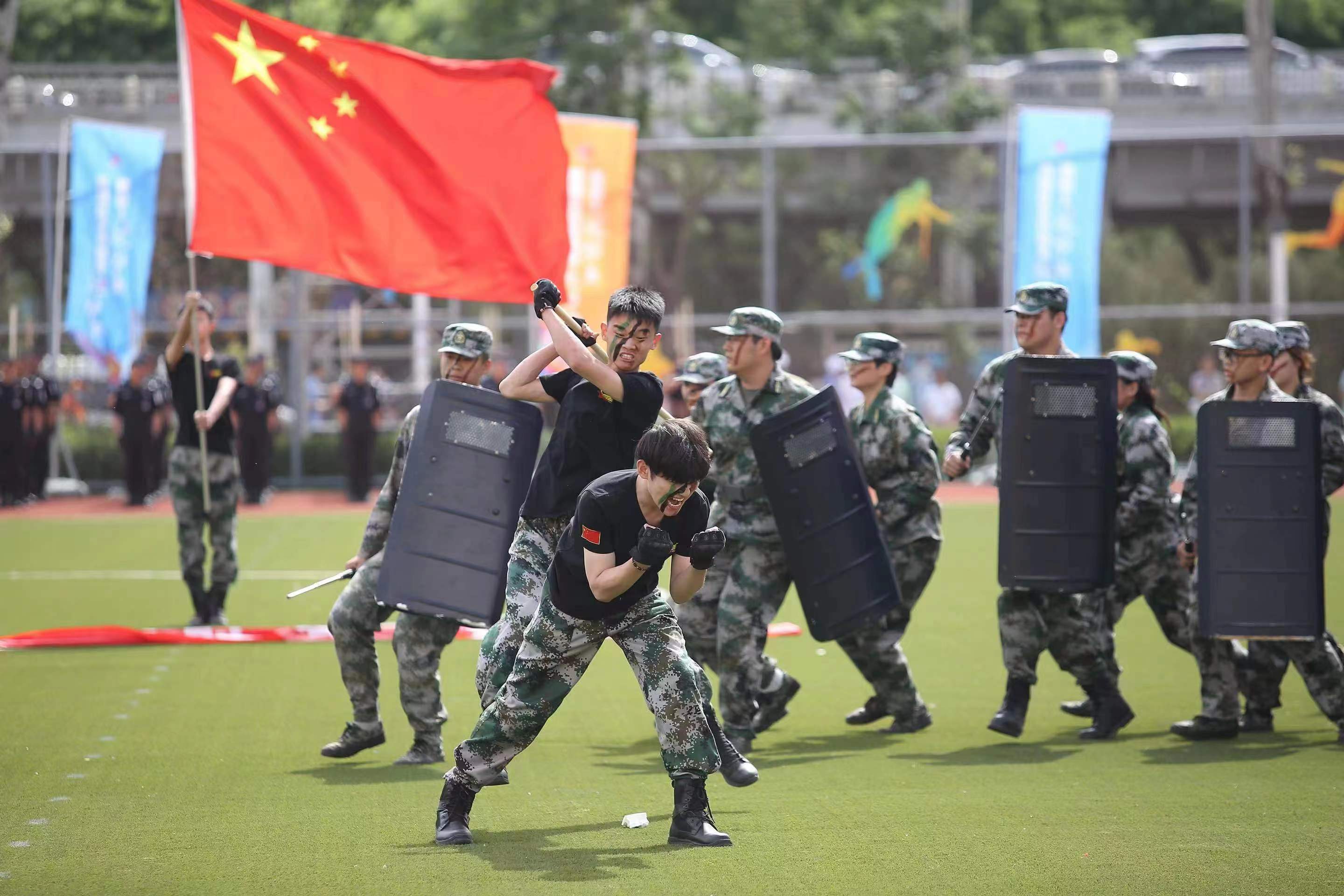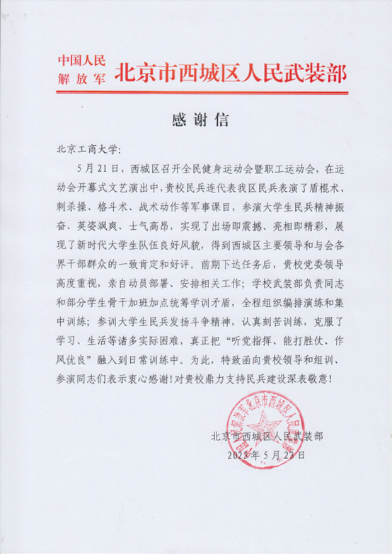 5月21日,北京市西城区全民健身运动会在月坛体育中心隆重举行。在开幕式文艺演出环节,我校大学生民兵连代表西城区武装部民兵组织表演军事科目《民兵风采》燃爆全场。西城区领导给予高度评价,西城区武装部给学校发来感谢信。