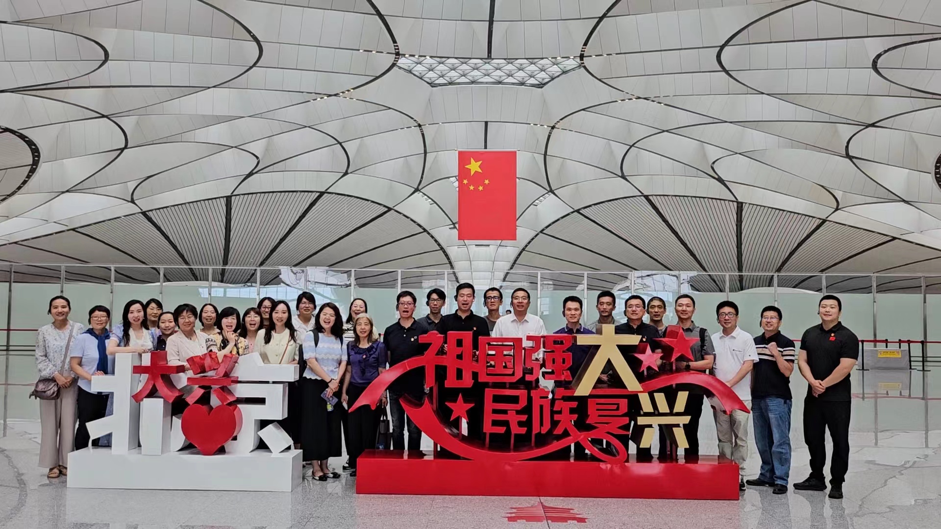通过参观走访,每一名参加活动的党员切实感受到了中国智慧和中国力量。大型仪器设备共享中心党员王晨萌谈到,近半年几次在大兴国际机场出行,航站楼采用五指廊构型,双层出发设计,从航站楼中心到最远端登机口步行时间不超过8分钟,为全球首创,比传统方式提高四倍,让旅客充分感受到了高质高效的服务。机场内充满文化底蕴和设计感的景观以及随处可见的“黑科技”等,都是大国工匠的卓越智慧与创新精神的完美融合。科学研究院党员赵浩讲到,大兴国际机场的现代化设施和人性化设计生动展现了祖国科技的飞速发展、基础设施建设的雄厚实力及智慧化出行的便捷与高效,通过实地参观深刻感受到了习近平新时代中国特色社会主义思想在京华大地的生动实践,是一个生动的爱国主义红色课堂。最后,同行党员们在航站楼四层教育基地展示区进行了集体合影,喊出了“祖国强大 民族复兴”的口号。