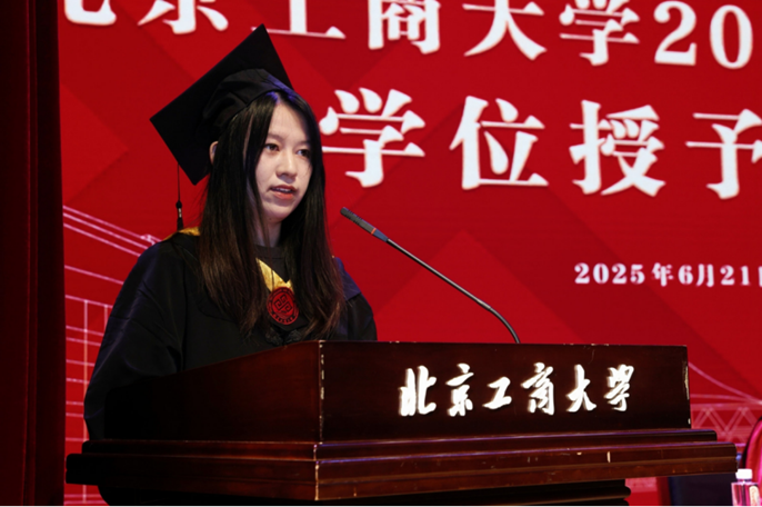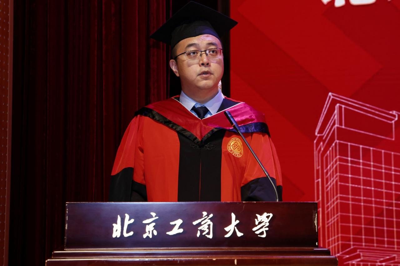 教师代表李赫教授发言。他谈到,教育是彼此映照、彼此成就的生命旅程,教师最大的幸福在于见证学生的成长与蜕变,对毕业生们在疫情反复中坚守学习、在科研攻关中勇于探索的精神给予了高度评价。毕业生不仅为服务国家食品安全与健康中国战略贡献了青春力量,还积极推动了学校食品学科“双一流”建设的稳步前行。2024年食品学子勇夺全国挑战杯揭榜挂帅专项赛特等奖擂主,刷新了学校的历史纪录。2025年我校在U.S.News全球最佳院校排名中再创新高,食品科学与技术跃居全球第9,农业科学提升至第12位,这些成就的背后,离不开每一位学子的辛勤付出与不懈努力。他勉励毕业生珍视求学过程中风雨同舟的伙伴,坚持敢于突破的勇气,激发思维碰撞的智慧,希望毕业生们弘扬学校“工商一体化”的理念,牢记学校“工以开物,商以富邦”的宗旨,勇敢面对未来的广阔与未知,祝愿毕业生“心中有光,不惧路长,脚下有力,行稳致远”。