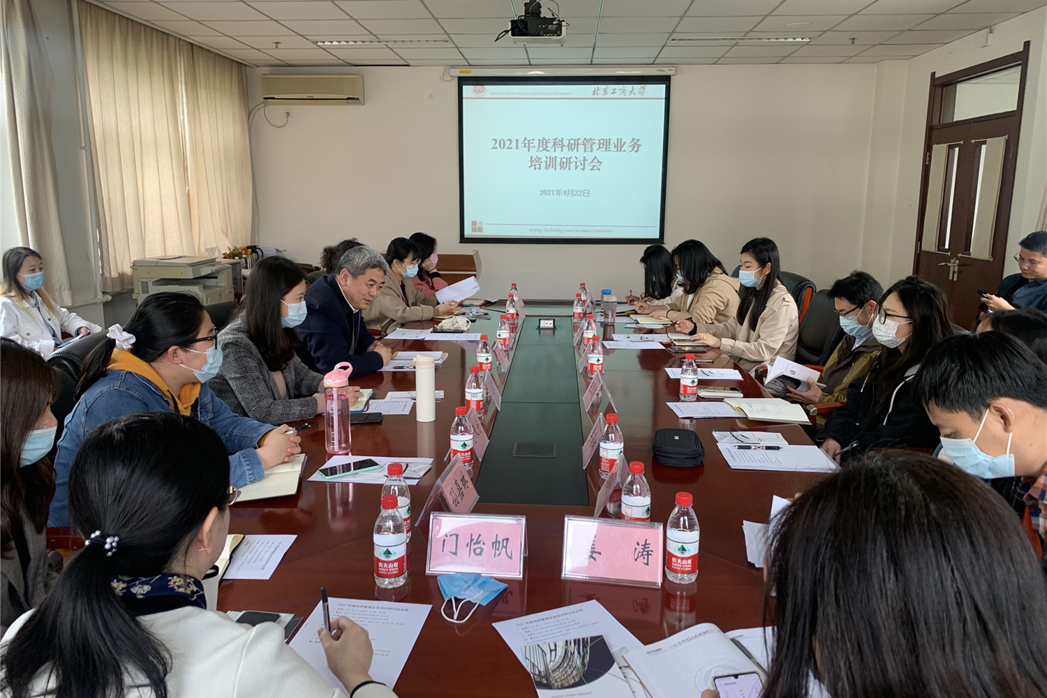 4月24日,学校在阜成路校区召开了2021年度科研管理业务培训研讨会,科学技术处处领导、各院(部)科研秘书,图书馆和科学技术处相关业务科室负责人参加了会议。会议由科学技术处副处长蔡喆主持。