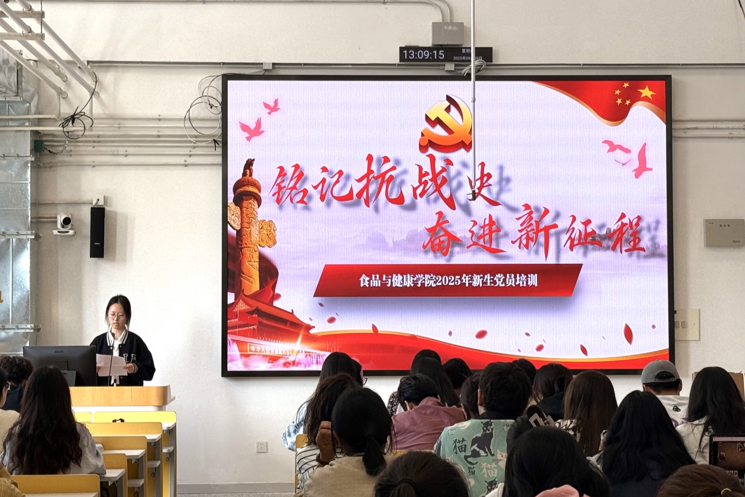 为加强新生党员的党性修养,强化历史使命感与责任感,激发爱国情怀与奋斗精神,在祖国76周年华诞来临之际,食品与健康学院于9月28日在食品大楼组织新生党员培训,开展“铭记抗战史·奋进新征程”主题党日。学院党委副书记熊慧、专职组织员李娜出席活动,活动由研究生新生辅导员赵婷主持。