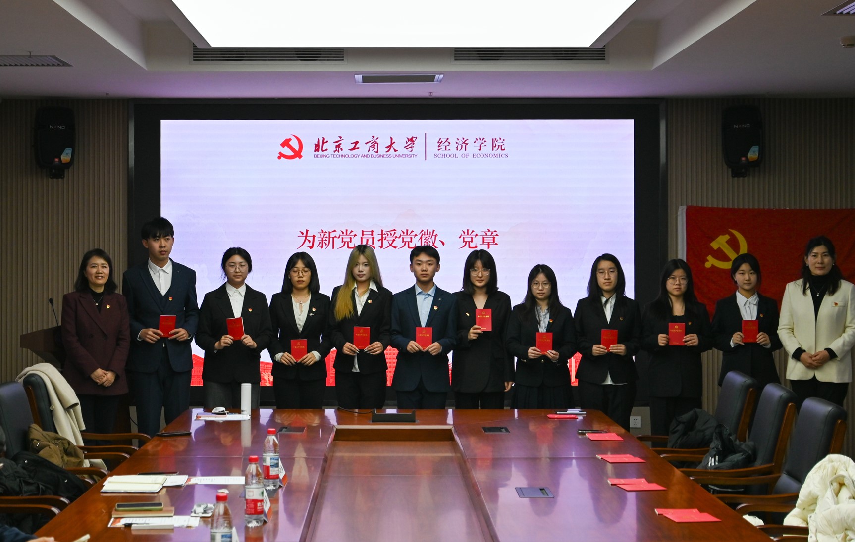 经济学院党委书记张春萍、副书记李艳春为新党员代表授党徽、党章。