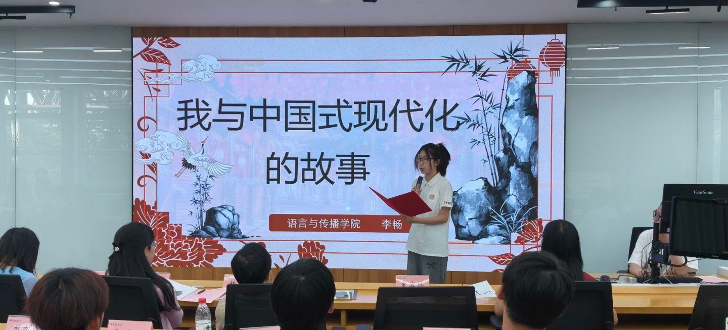 参赛选手各展风采。设计与艺术学院的袁梦同学以精彩的表演和生动的讲述描绘了普通民众如何凭借自身的智慧和努力在中国式现代化的宏大篇章中成为主角;语言与传播学院陈昱璇同学娓娓道来她记忆中的那座庙、那条河在历经荒芜和腐臭后在中国式现代化东风里焕然一新;经济学院胡云涛同学则以“素纸”为线索,巧妙地串联起百年间南湖红船上的坚定信念、核基地计算纸上的精密数据和当代青年手机备忘录中的点滴思考,揭示了中国式现代化中的传承与创新。