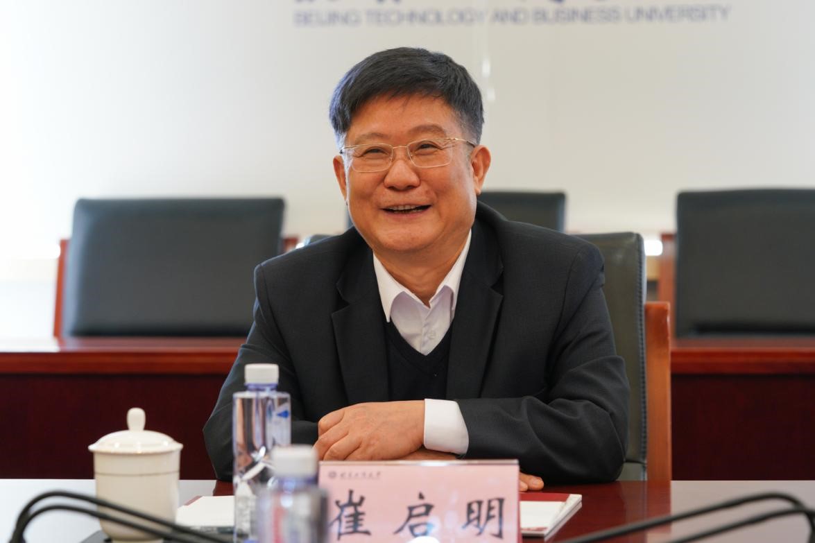 黄先开代表学校对崔启明一行来访表示热烈欢迎,并介绍了学校的基本情况、办学定位和发展方向。他谈到,近年来,学校坚持以高水平研究型大学建设为目标,以首都经济社会发展需求为导向,大力调整学科专业布局,加快推进学校转型发展,充分发挥商科、轻工和食品学科优势,积极服务首都城市战略定位,为首都“两区”“三平台”、数字经济发展、国际消费中心城市建设等提供了有力的人才支撑和智力支持。希望双方进一步交流经验、增进了解、深化合作、共谋发展。