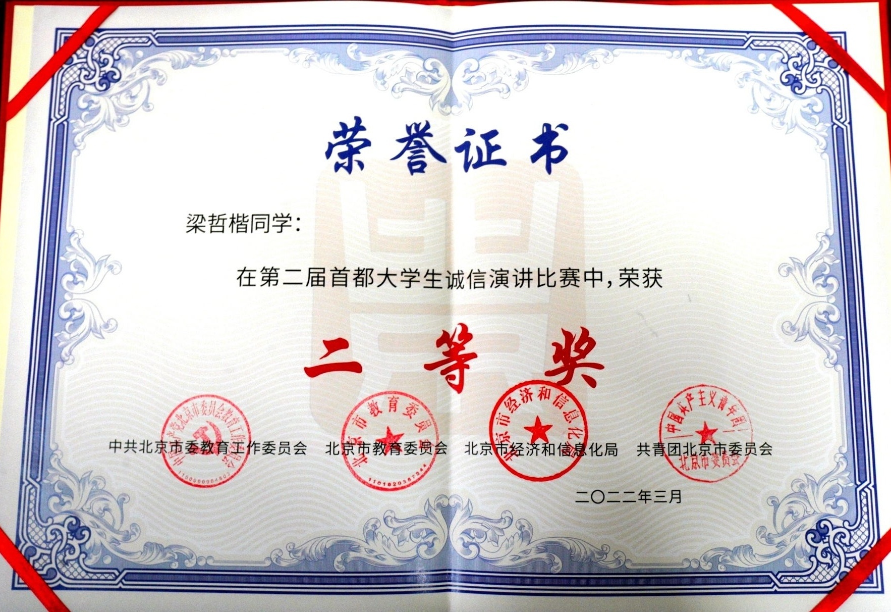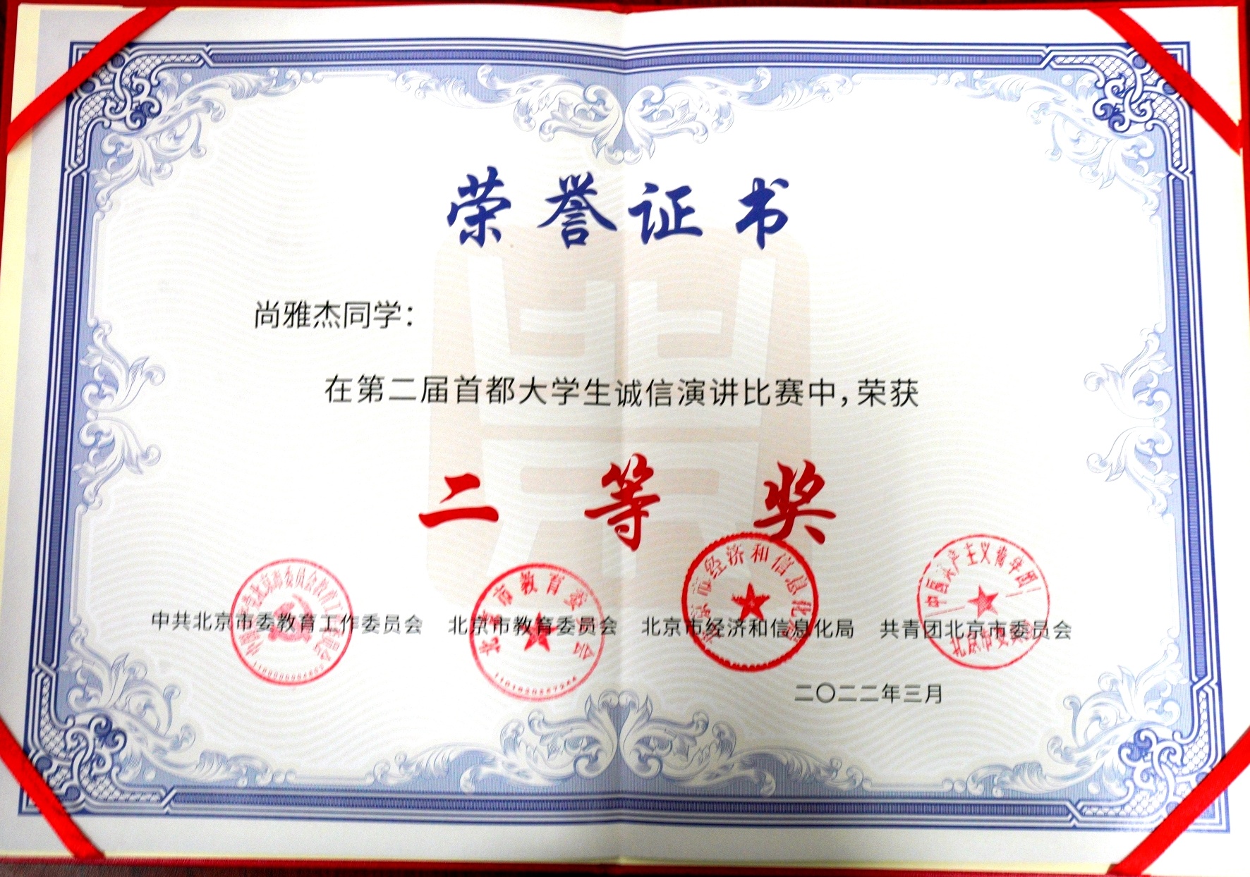 近日,由中共北京市委教育工委、北京市教育委员会、北京市经济和信息化局以及共青团北京市委员会联合主办的第二届首都大学生诚信演讲比赛获奖结果公布,我校传媒与设计学院广告201班任相睦荣获一等奖,外国语学院西语19班尚雅杰、传媒与设计学院传媒214班梁哲楷荣获二等奖。我校获评优秀组织奖。