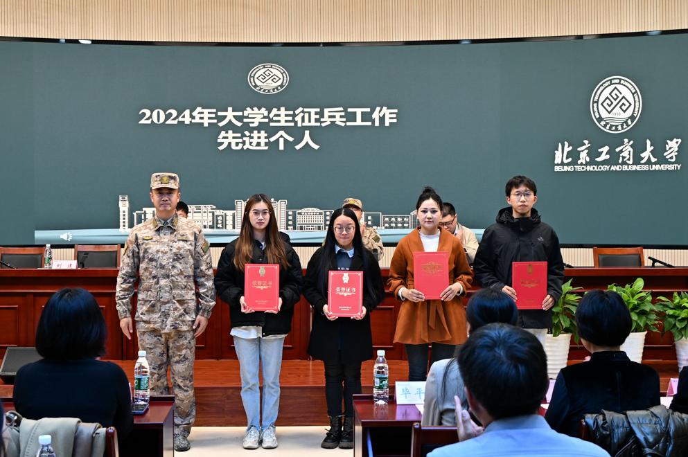 在征兵工作总结表彰环节,郑光宣读了《北京工商大学2024年大学生征兵工作表彰决定》,商学院、计算机与人工智能学院、食品与健康学院、语言与传播学院超额完成征兵任务,荣获征兵工作先进单位。计算机与人工智能学院阿月尔、商学院赵杰、食品与健康学院尹皓霙倢、语言与传播学院李池莉荣获征兵工作先进个人。与会领导为先进个人和先进单位颁发了荣誉证书。