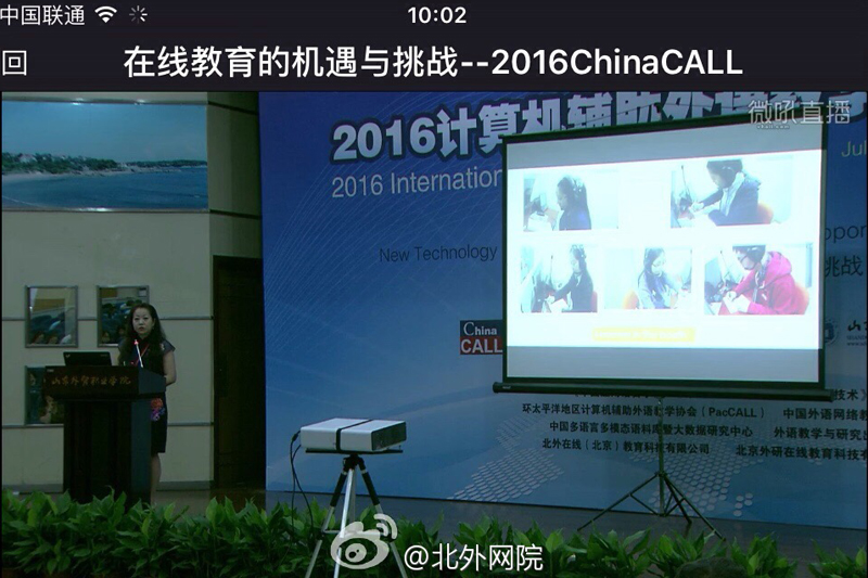 2016年计算机辅助外语教学国际研讨会于7月21日—23日在山东青岛隆重举行。来自英国、澳大利亚、马来西亚、日本等国的在线语言教学专家以及国内专家、学者和从事计算机辅助语言教学的教师近400人出席研讨会,共同探讨大数据、云服务、社交网络等技术应用对传统教育观念、教育体制和人才培养模式带来的机遇和挑战。本次大会在形式上也采取了创新的模式,除面对面的会场发言和交流之外,对大会的主会场进行了全程直播,共计1.5万网友同步在线观看网络直播并参与互动,产生了良好的社会效应。