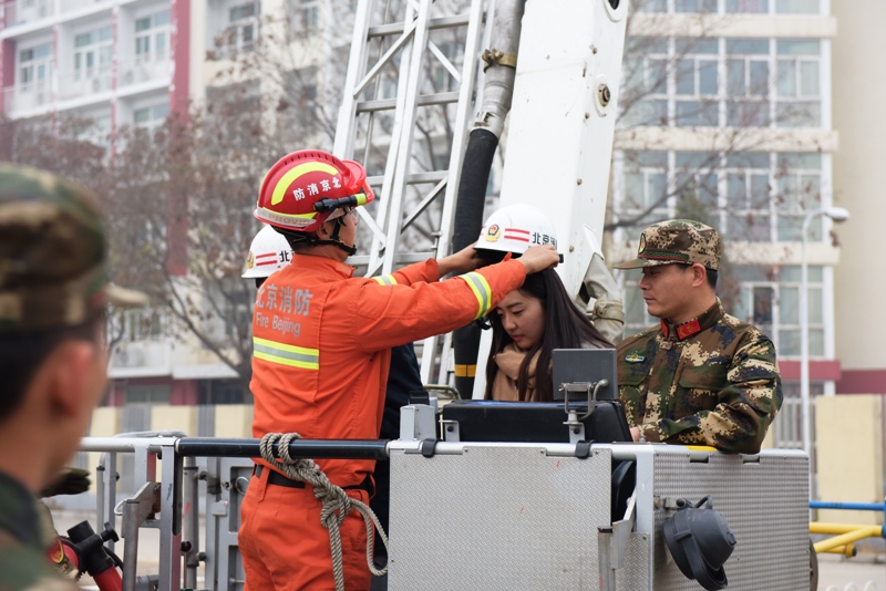 16:30,随着张耘副校长的一声令下,消防演习正式开始。此时,8号楼警报鸣响,烟雾滚滚,800余名新生分别从各自宿舍迅速而有序地疏散到集结区域。参演学生根据在消防培训中学到的知识,以毛巾掩住口鼻,弯腰快步地从烟雾中撤离到指定地点。模拟现场非常逼真,疏散过程紧张而有序。现场还设置了消防逃生体验帐篷、高空云梯救援、体验穿戴消防战斗装备等。消防战士还讲解和示范了灭火器使用方法。随后,保安人员点燃了火堆,参演的师生亲身体验了用灭火器灭火的实际操作,取得了良好的演练效果,也达到了预期的教育目的。